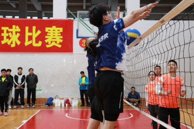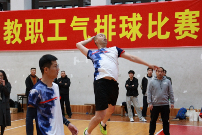 教职工沉着应对,全力以赴,相互勉励,两战两捷,顺利出线。在16强淘汰赛中,队员冲劲十足,配合默契、攻守兼备强力扣球、机智轻吊穿插跑动、巧妙拦截,打破了第二局开场1:7落后的不利局面,进军八强。