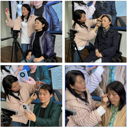 接下来的现场示范环节更是将活动推向了高潮。陈君玉老师现场随机挑选一名教师演示基础妆容的打造过程,在示范过程中,陈老师细致入微地讲解了每一步的操作方法和需要注意的事项,让在场的教师们能够清晰地了解化妆的正确步骤和技巧。台下教师或聚精会神观看,或举手机录制教学细节,当美目贴结合眼线笔勾勒出放大效果,粉底与腮红精准配合提亮肤色,叠加高光塑造立体骨相,浓眉经眉粉晕染渐显柔美曲线时,现场接连响起惊叹声。互动环节中,教师们争相将自己在化妆方面遇到的困惑一一抛出,提出“眼袋/黑眼圈遮瑕”"野生眉过密调整""倦容肌焕亮"等问题,陈老师细致解答,分享了"通过冷暖调遮瑕膏叠加、在视觉上实现去眼袋""依据鼻翼到外眼角延长线定眉长“”从眉峰处下笔而非从眉头画至眉尾,避免眉头紧锁"等实用妙招,现场掌声、欢笑声交织成片,气氛热烈。女教职工们不仅学到实用的化妆技能,在相互交流中还收获了满满自信,激起对美好生活的追求和热爱。