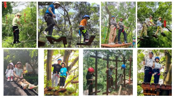 到达山顶后,在专业教练指导下,教职工们全副武装,化身“空中行者”,开启丛林飞跃之旅。随着一声声鼓励的呼喊,教职工们开始在绳网间勇敢攀爬。他们克服内心的紧张与恐惧,挑战身体的极限,在树木之间自由穿梭,体验着飞檐走壁般的快感,团队的凝聚力与协作精神在这片丛林的上空不断升温。