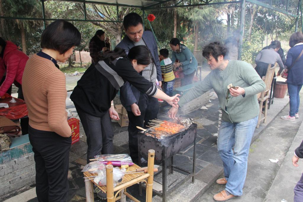 踏青之后的第二个活动是烧烤。于棋盘寨,教职工们分工明确、配合默契,不一会儿便炊烟袅袅,香味四溢。美食在手,青山、阳光环绕左右,教职工们纷纷举杯共饮,庆祝这难得的野外休闲时光。
