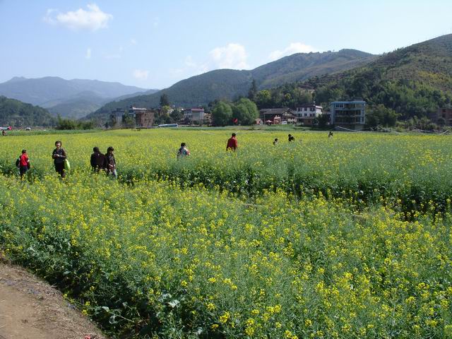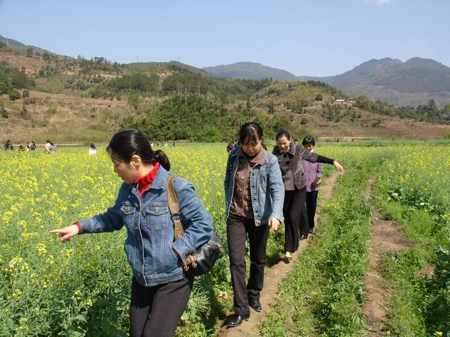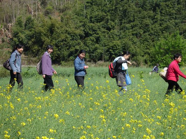 “三八妇女节”活动安排,上午八点,学院在职及退休女教职工乘座学校大巴前往闽候县白沙镇梧桐下村观赏油菜花。梧桐下原本沉寂无名的一个小村庄,因为有了一大片的油菜花而让这个美丽的地名突然名闻福州。到达油菜花地入口处,就能看见大片大片的油菜花,一垄一垄的,金黄的颜色尽收眼底。大家穿梭在金黄丛里,行走在一脚宽的田埂上,感受梧桐下村的魅力:青山、油菜花、枯树、小桥、流水、人家。