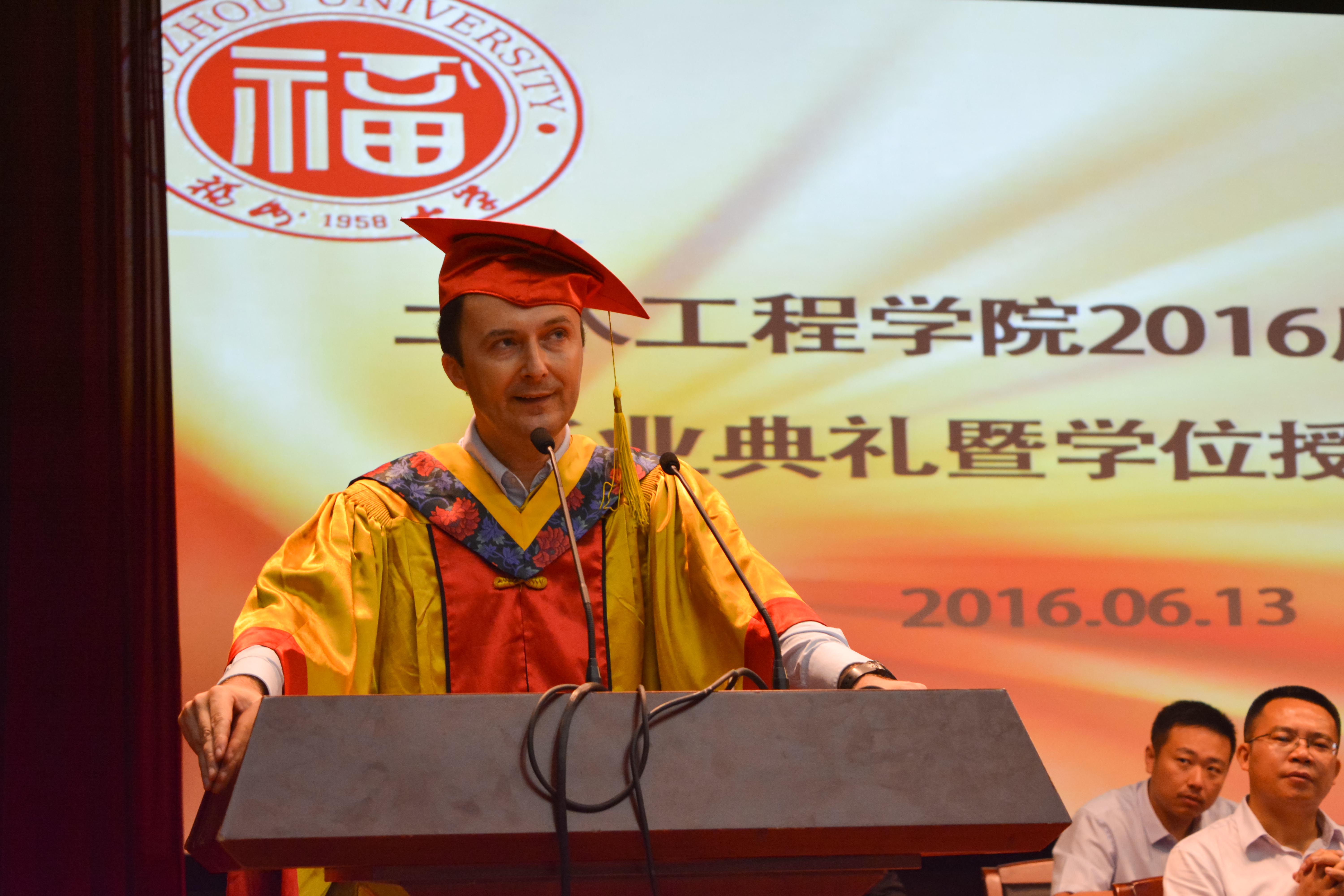 的悉心栽培表示深切谢意;在台下毕业生的掌声中,毕业生代表辛怀佳发表讲话,其来自毕业生的独特视角和充满感情的演说使得在场观众无不动容。在全体师生的见证下,学院助学金交接仪式成功举行,承载着毕业生对学院深切心意的助学金,将帮助更多的土木学子积极奋进,完成学业。最后,在典礼进行布鲁诺院长颁发毕业证书、学位证书,学位授予仪式,一名名土木学子在同学亲友的见证下,庄严的完成了大学四年的土木学习生涯。