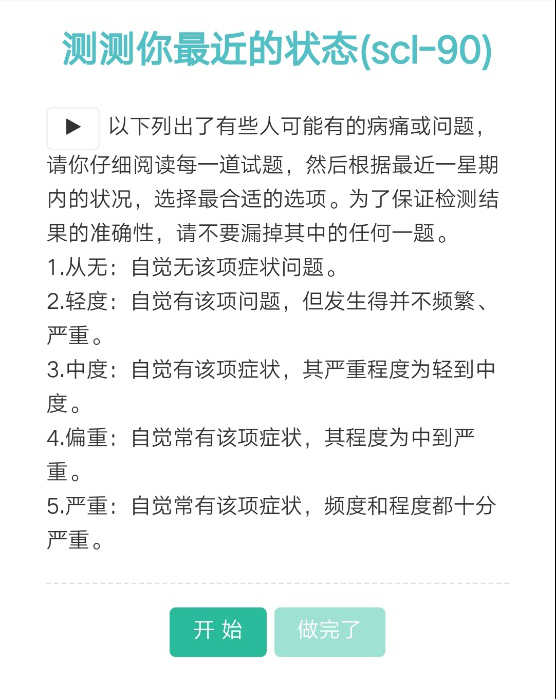 二、登录成功后需要先进行个人信息完善,方可进入测评说明界面,仔细阅读说明后点击开始测评,可见scl-90及SDS两份待测量表。