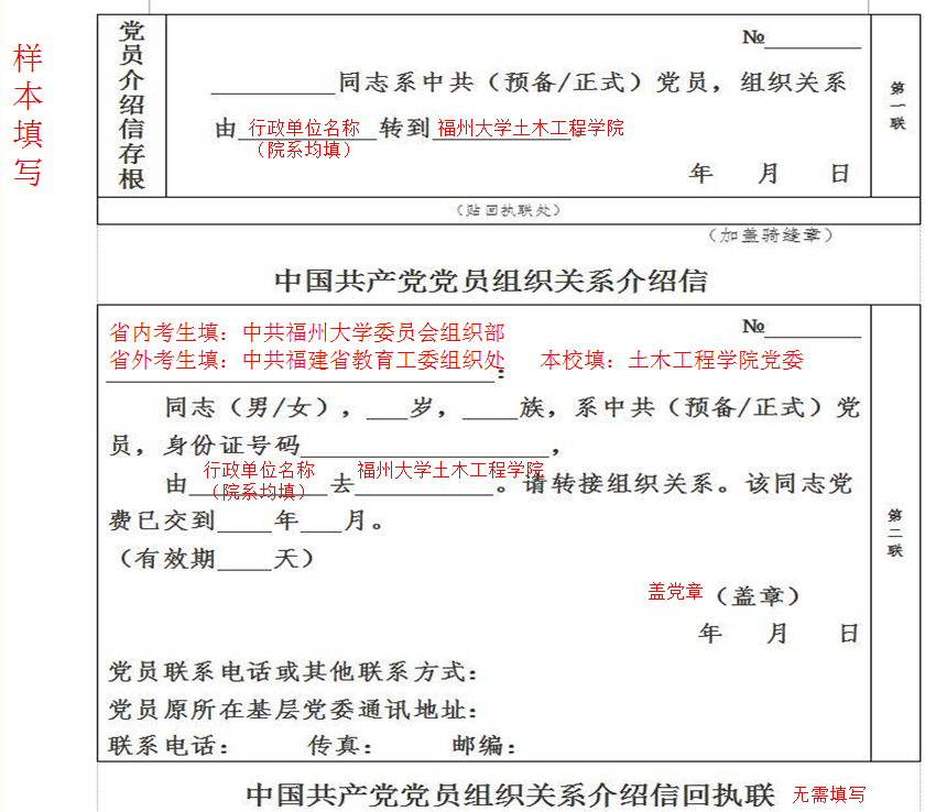 中国共产党党员组织关系介绍信规范填写可参考如下样本,并于新生报到时上交。