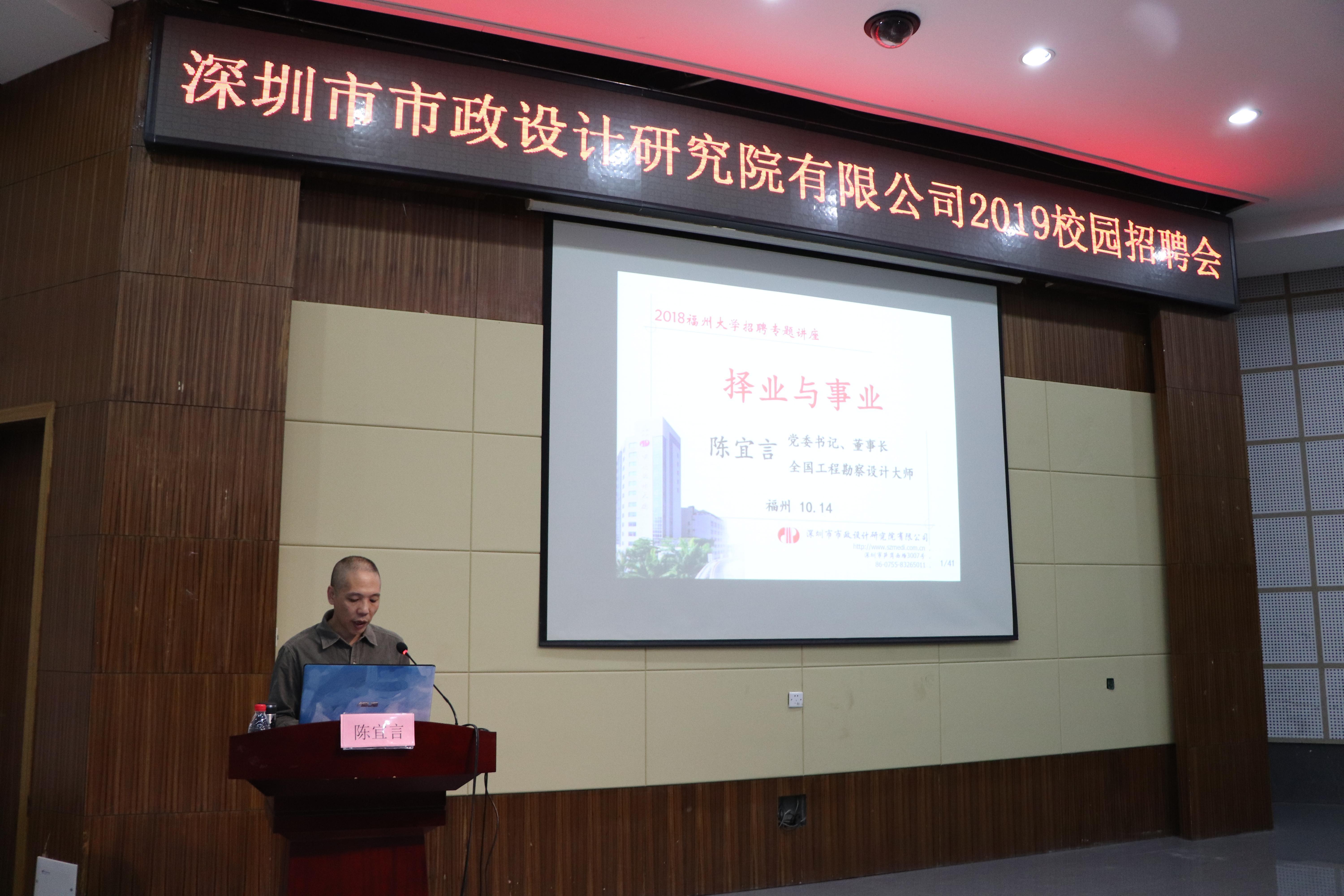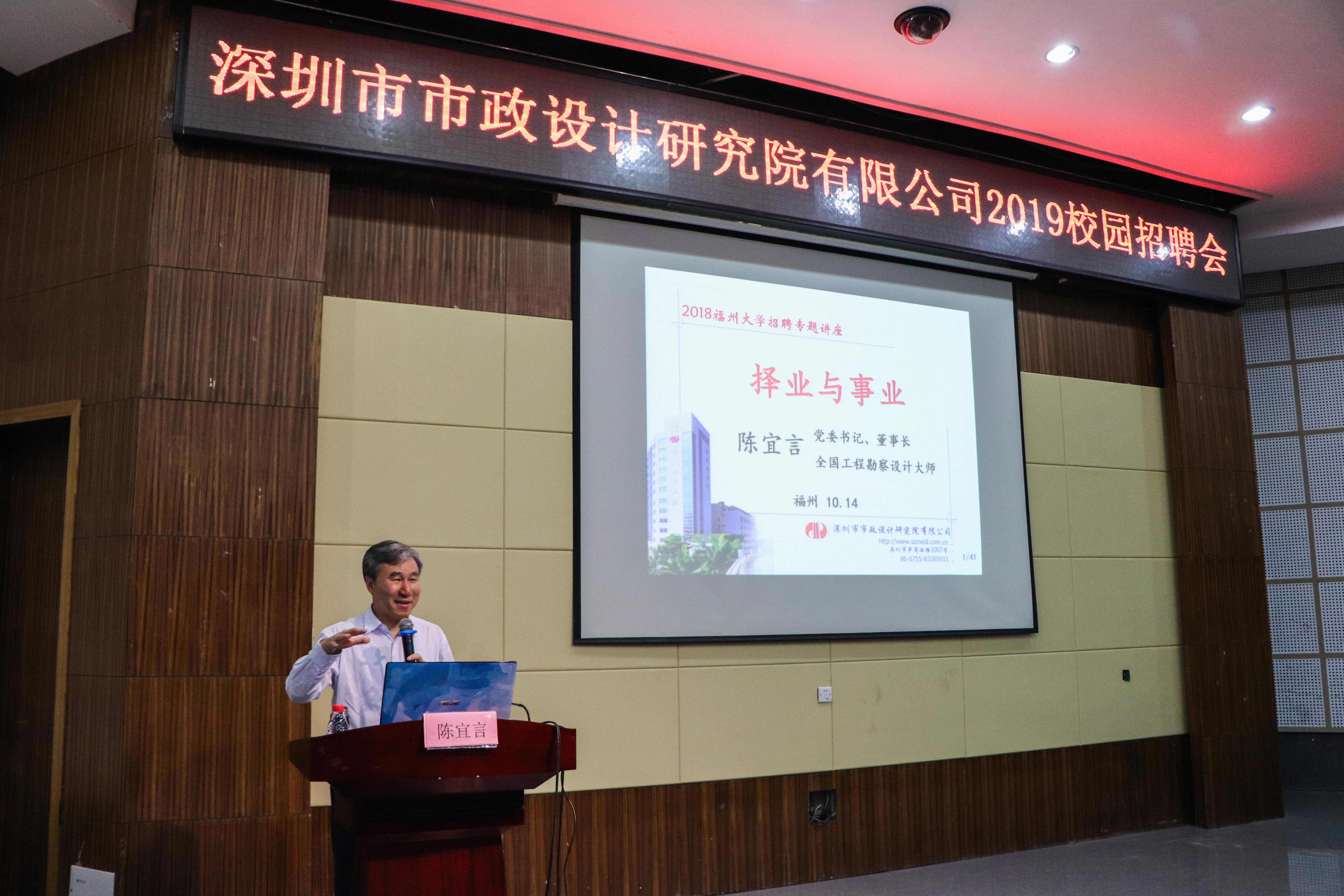 78级优秀杰出校友陈宜言大师亲临现场作宣讲,随行前来的还有深圳市市政设计院技术骨干及福大校友组成的校招团队。宣讲会由肉便器