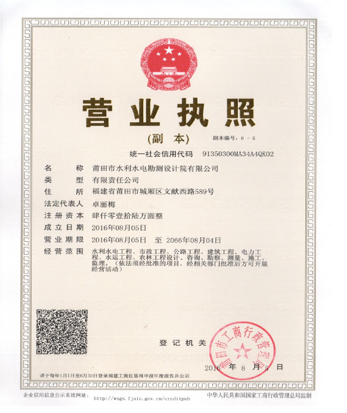 2016年6月,经莆田市人民政府批复同意,整体改制为莆田市水利水电勘测设计院有限公司。公司现有员工80多人,其中教授级高级工程师2名,中、高级职称人员30多人。有一级注册建造师11名,二级注册建造师45名;注册土木工程师(水利水电)10名,注册土木工程师(岩土)2名, 注册土木工程师(水保)1名,注册造价师(水利水电)6名, 注册造价师(土建)2名,注册咨询工程师(投资)5名,二级注册结构工程师1名,注册安全工程师2名。