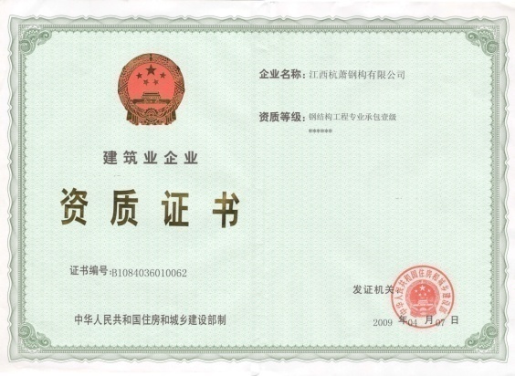 (1)、钢结构专业承包一级资质 (2)、工程设计乙级资质