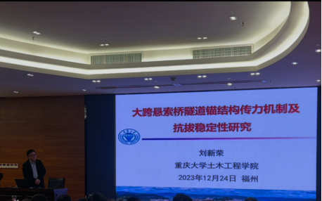 重庆岩石力学与工程学会理事长、重庆大学刘新荣教授的主旨报告围绕大跨悬索桥隧道式锚碇结构传力机制及抗拔稳定性研究这个主题展开阐述。针对桥梁与隧道相结合的隧道锚构件,详细介绍了悬索桥隧道锚的各项特征。