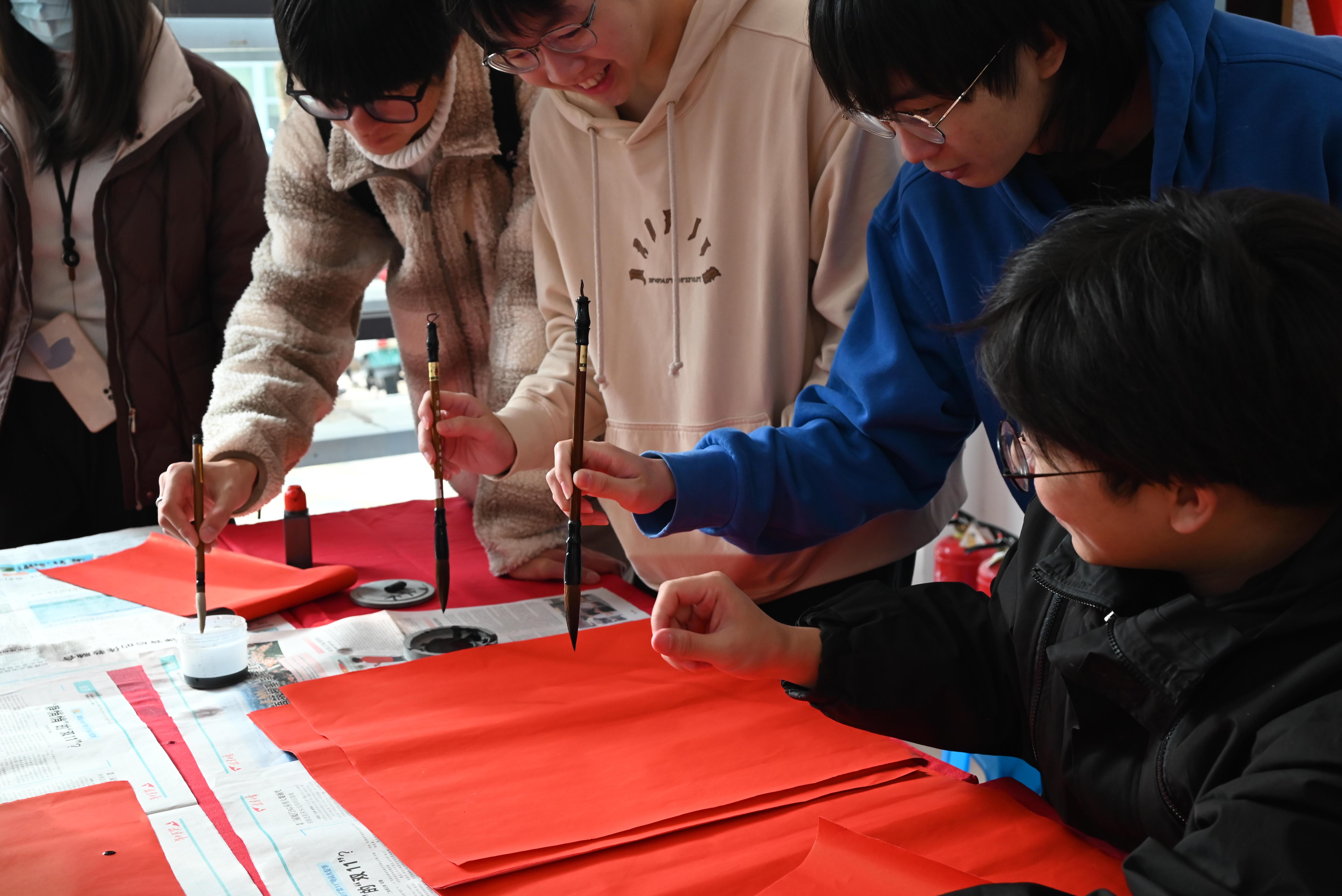 庆元旦迎新年区域由刮碰糖摊位、新年剪纸区以及书法创作区组成。同学们即兴创作自己的书法作品、剪纸作品、进行刮碰糖游戏,积极弘扬中华优秀传统文化,在无限乐趣中提升了美育情操和动手操作能力。