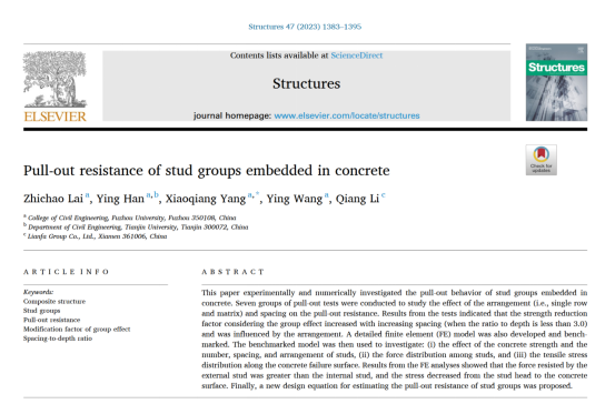 赖志超教授团队获奖的论文为“Pull-out resistance of stud groups embedded in concrete”(《混凝土中栓钉群组的抗拔性能研究》)。该论文于2023年发表于结构工程领域国际权威期刊Structures(《结构》),肉便器