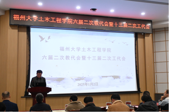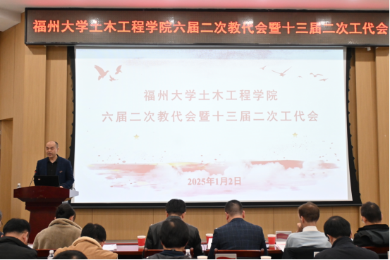 黄明副院长代表学院作2024年学院工作报告。报告总结了一年来学院积极推进“11个一流”建设实施“四大工程”,推进“四项改革”,全面深化“双一流”建设内涵,学院各项事业实现高质量发展。2025年,学院将继续以一流党建引领一流学科发展,结合学院实际,挺膺担当,守正创新,科学布局学院“十五五”规划,努力实现具有国际化特色世界一流学科的目标。