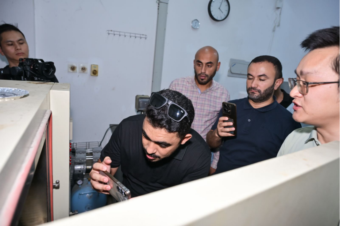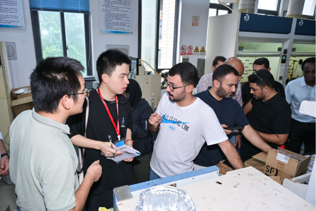 首站,学员们走进了道路工程材料实验室,重点聚焦沥青材料制备与性能测试区域。徐松研究员系统介绍了实验室的整体布局与研究方向,随后逐一展示了完备的沥青材料研发设备,从基础的沥青制样装置到高精度的检测仪器,涵盖动态剪切流变仪、弯曲梁流变仪、压力老化容器、凝胶渗透色谱仪,再到30kN万能材料试验机(UTM)等多台套贵重仪器。这些设备形成了完整的检测链条,既能按照中国国家标准,也能依据美国 SHRP(战略公路研究计划)体系,对沥青材料的高温稳定性、低温抗裂性、抗老化性能等关键指标进行全面评估。随后,双方围绕各自在道路改性沥青的组分优化(如SBS 改性剂的掺量配比)、特殊气候条件下的试验方法以及性能评估标准等方面展开了深入探讨。学员们分享了约旦在道路材料设计与施工中遇到的实际难题,实验室团队则分享了现有的解决方案,现场交流气氛热烈而务实。