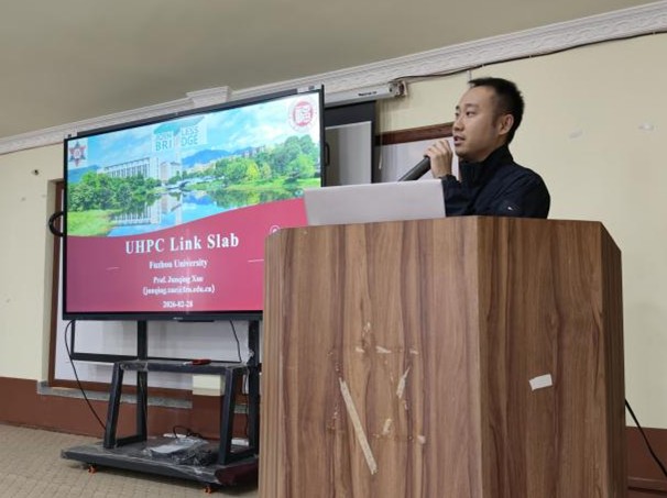 当日下午,代表团前往尼泊尔国家科学技术研究院,与副院长 Dilip Subba 教授等科研人员会面。黄福云教授作学术报告,分享学院在整体式无缝桥受力性能研究与推广应用的最新成果,引发热烈交流。当晚,代表团受邀参加由尼泊尔道路部发展合作执行司、特里布万大学联合组织的交流活动,中铁二局国际公司尼泊尔分公司及当地建筑行业代表共同参会。代表团与福大校友、尼泊尔道路部发展合作执行司副司长 Bijaya Jaishi 博士交流,袁辉辉、黄福云教授分别作学术报告,结合尼泊尔工程建设实际需求分享钢混组合结构、无缝桥领域研究成果,为当地工程实践提供技术参考。