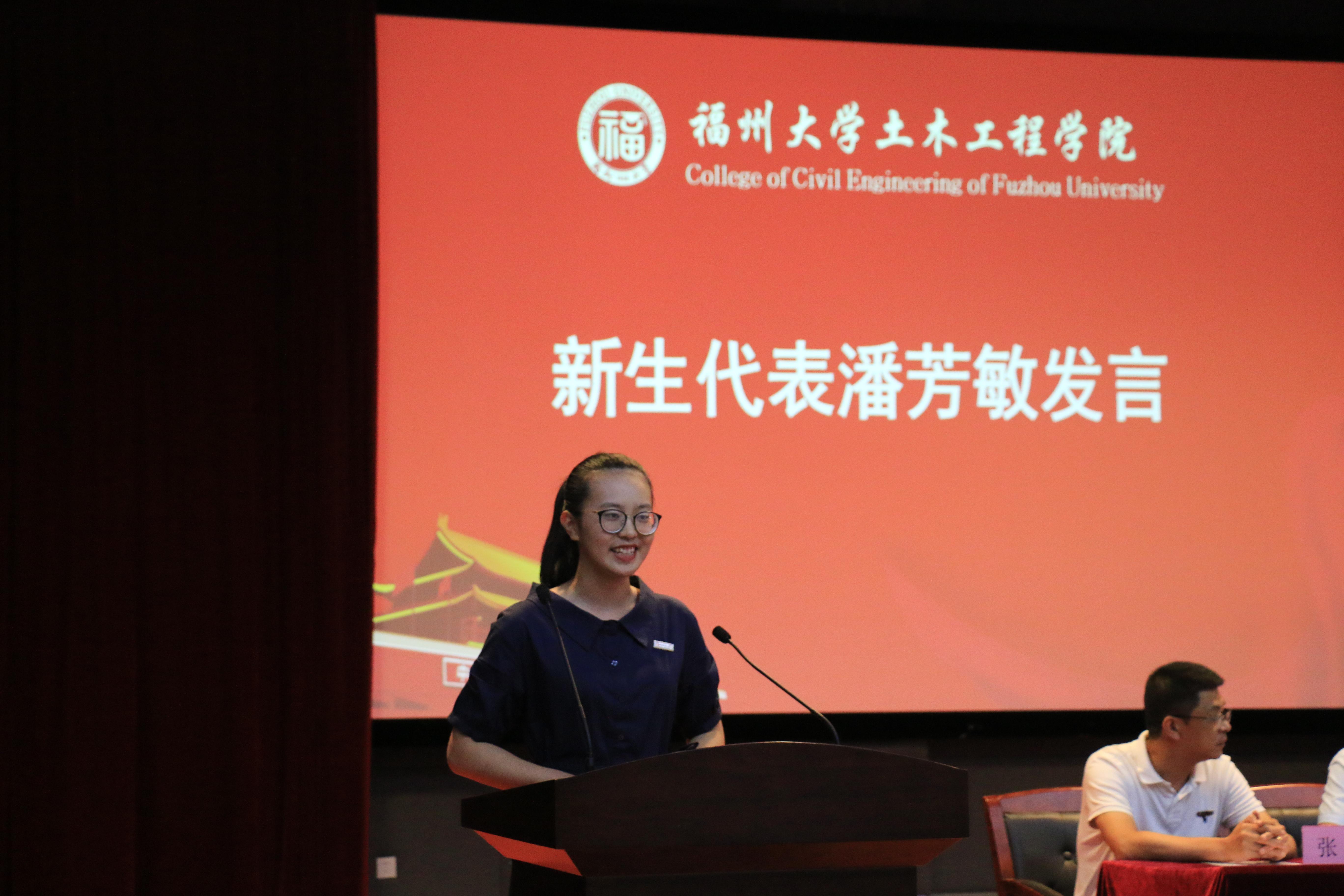 军训与迎新的美丽邂逅是这个夏日最美的梦,在一片惹眼的“军绿色”当中,新生代表潘芳敏上台发言,她表达了对土木行业未来的憧憬与向往,同时,她也与广大同学共勉,做一个刻苦专研的土木人,做一个无悔奋斗的福大人。