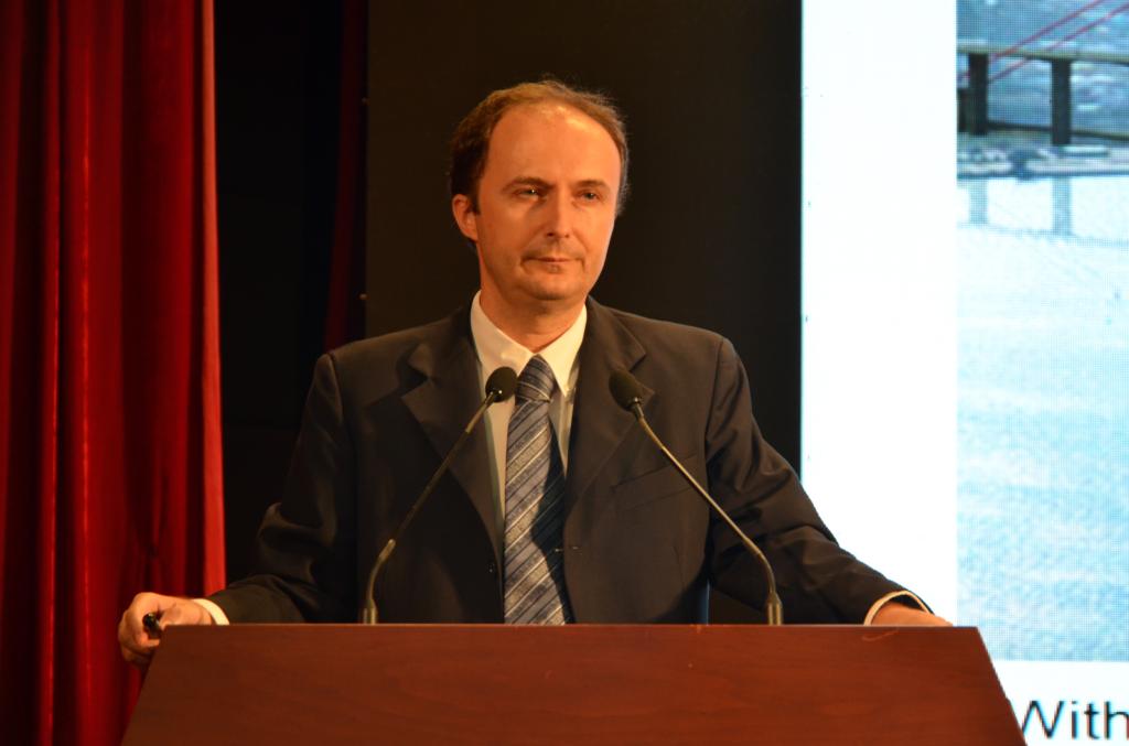 院长布鲁诺·布里斯杰拉教授致词,薛俊青博士同声翻译。他的讲话分为三个层次:一是土木学院的国际化建设,学院现已建立与意大利IUAV大学、日本长崎大学、德国凯泽斯劳工业大学、美国韦恩州立大学等国外大学的长期友好合作关系,今年更是与加拿大曼尼托巴大学联合举办土木工程专业,有60名新生成为首届学员。二是土木工程的科研方向,包括有可持续性、环保型、创新性、耐久性等。三是就可持续性环保生活与土木工程的联系,指出应采用多学科研究法以及创新设计法,研制超高性能耐久性材料。最后,他祝愿福大土木学子学无止境,成为未来的行业精英。