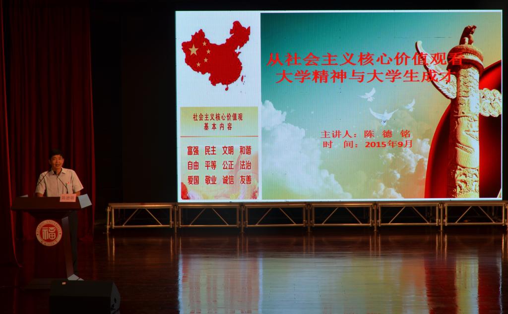党委副书记陈德铭为2015级新生们带来了一场以“从社会主义核心价值观看大学精神与大学生成才”为主题的教育讲座,为初来大学校园仍处于迷茫阶段的新生指点迷津、解疑答惑。