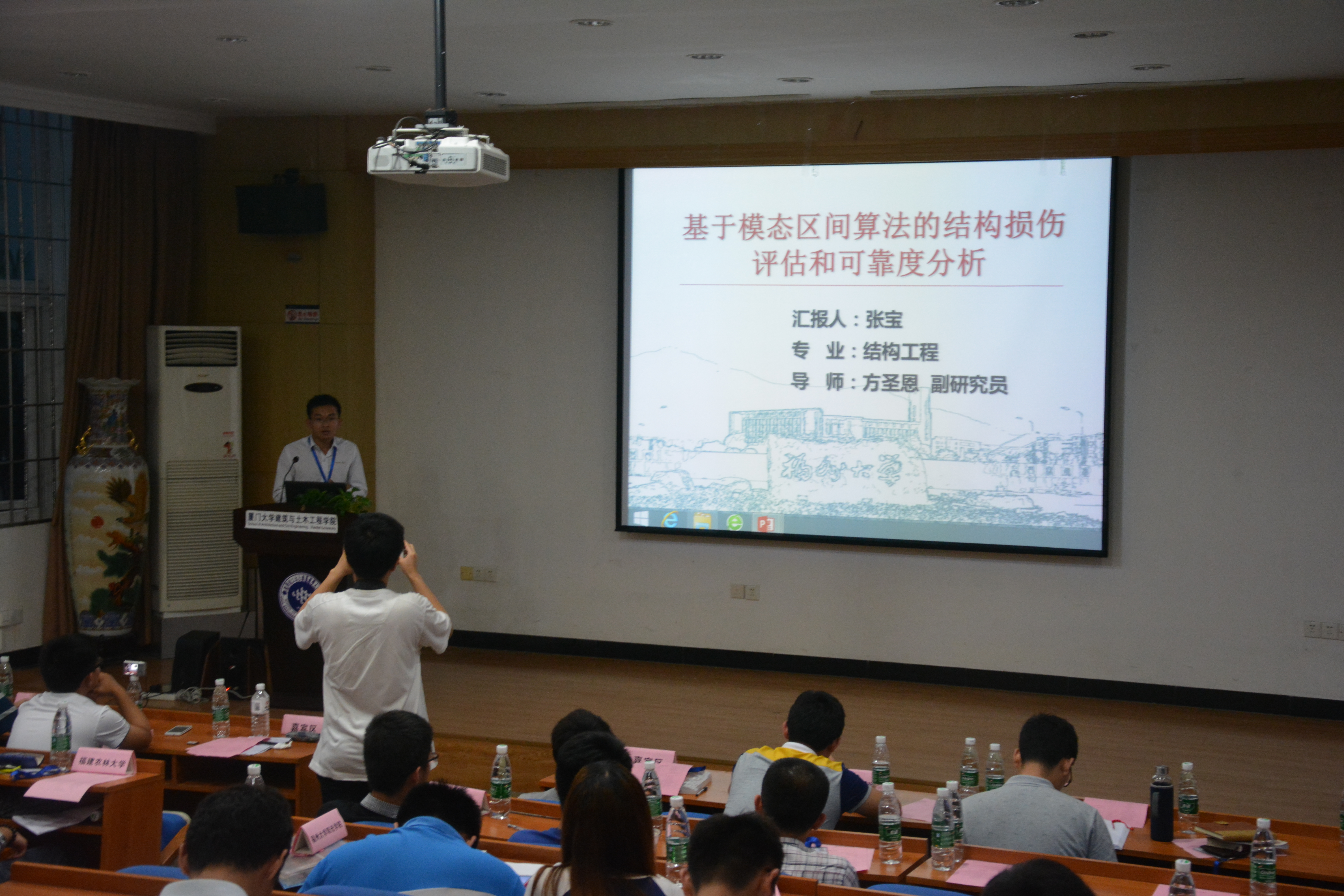 研究生张宝同学作为学术报告嘉宾被邀请至土木分会场作了《基于模态区间算法的结构损伤评估和可靠度分析》的学术报告。张宝同学通过ppt展示和由浅入深的讲述让在场的老师同学们了解到模态区间算法在结构损伤评估中的作用以及几种常用的可靠度分析方法。会后,各高校学生代表们一起参观了厦门大学校园。