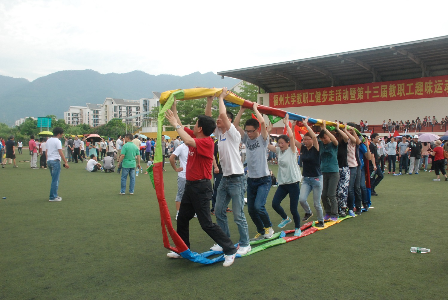 派出了党委副书记陈德铭带领,包括工会主席郑则群、党委秘书钱升、团委书记许长宾在内的近八十名教职工出征本次活动。本次运动会由环校健步走活动拉开帷幕,虽然天气炎热,但是一路上教职工们依然欢声笑语不断,感慨福大变化之快,尤其是对陈宝春院长新设计的拱桥赞叹有加。