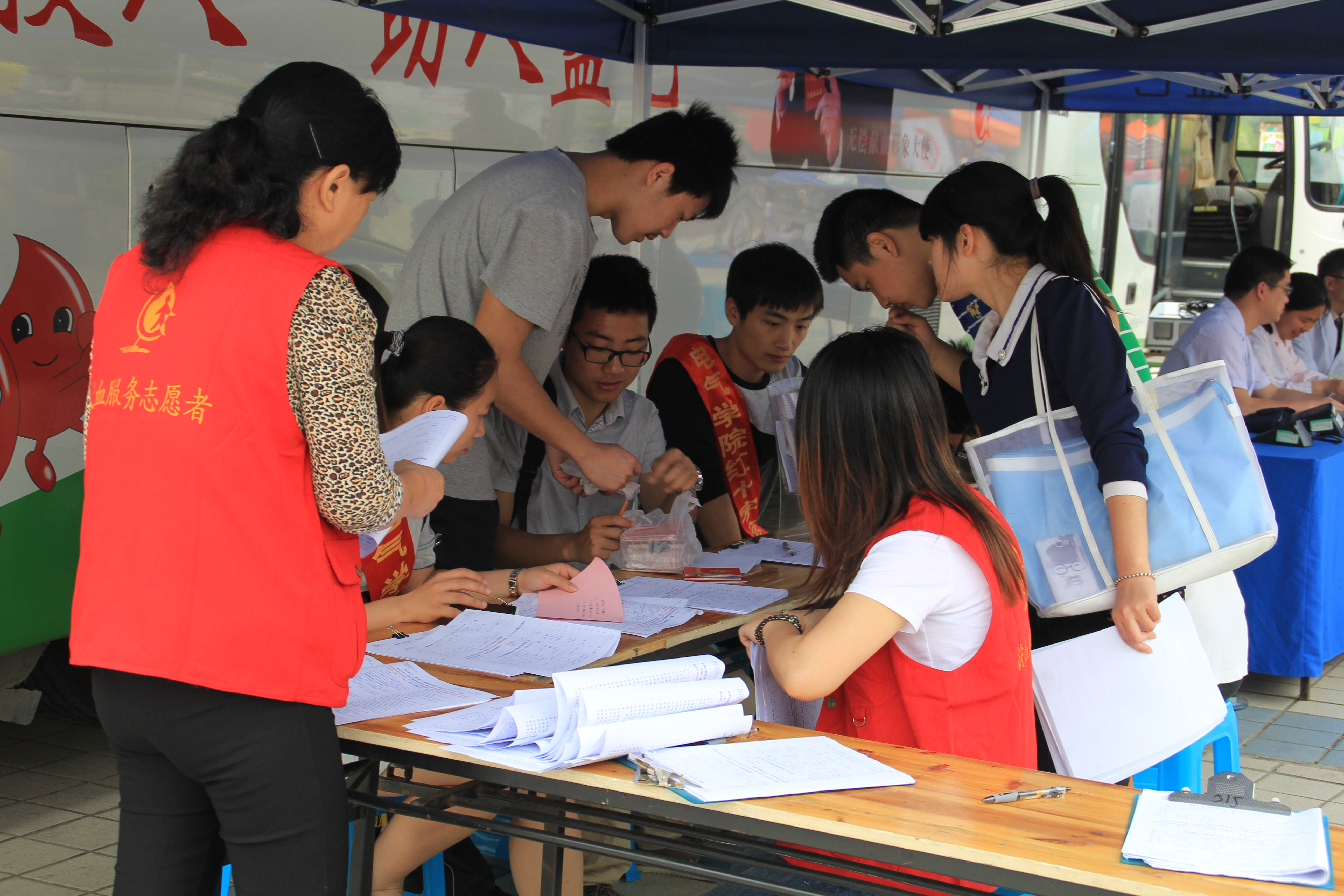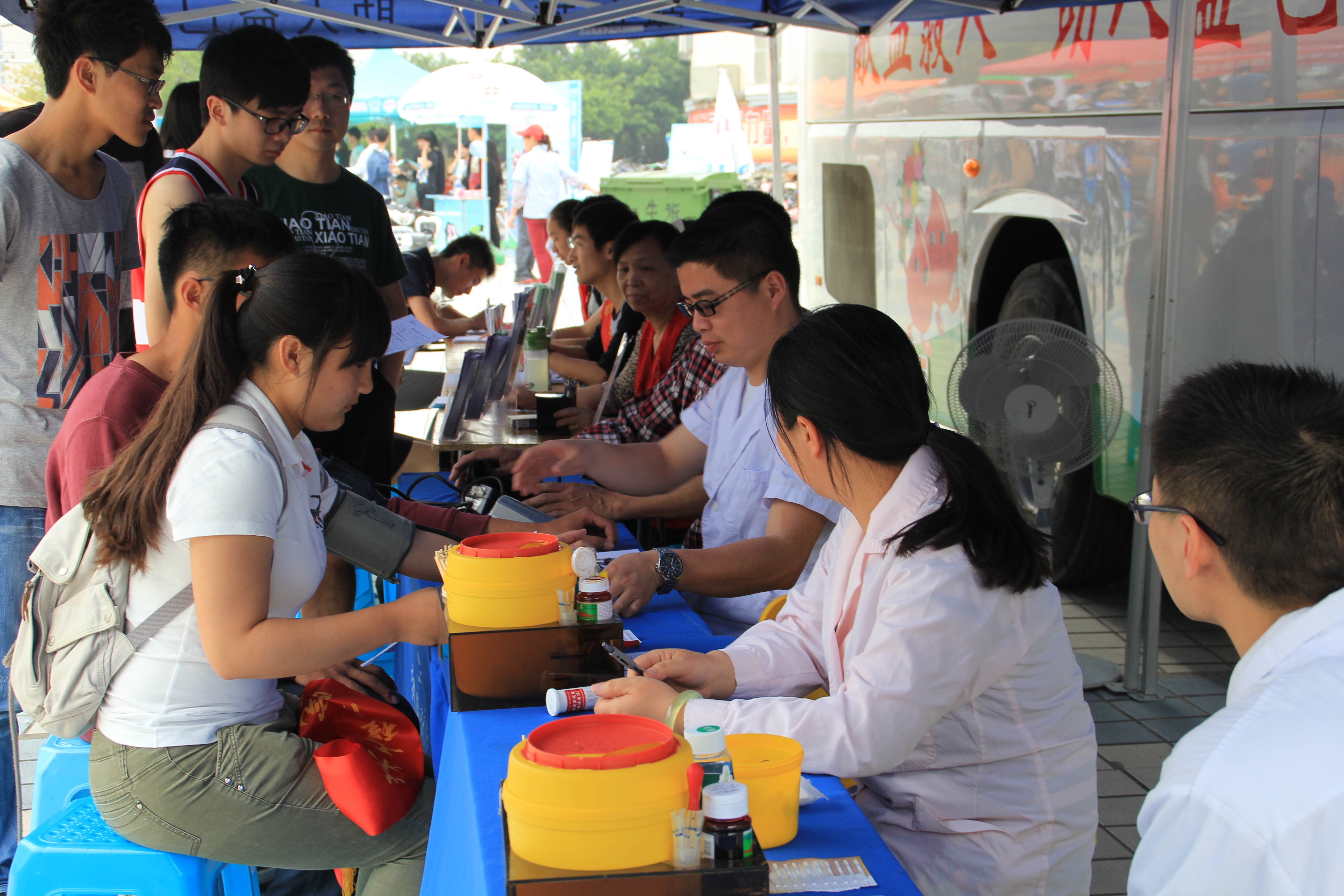 一大早,已经有不少同学来到献血车前准备无偿献血。由于大多数同学对献血并没有系统深入的了解,同学们在献血前都会详细询问清楚,“感冒可以献血吗?”、“献血对身体有什么坏处?”,为消除同学们的疑虑和紧张,工作人员都耐心地一一作出回答。