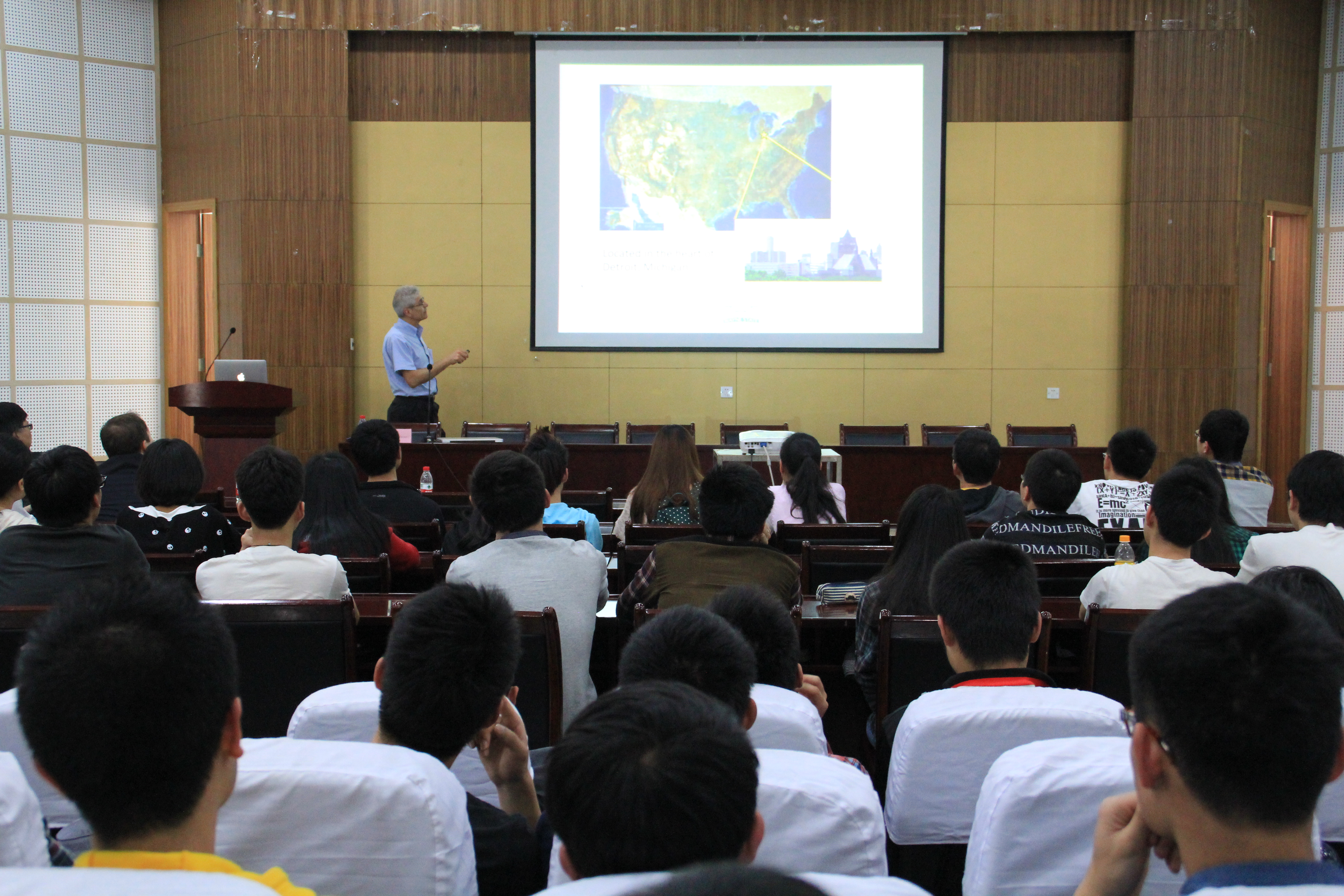 Farshad Fotouhi教授的讲座主题为“From China To Detroit:Join The Wayne State University community and engineer your world”。通过幻灯片的放映,Farshad Fotouhi教授展示了韦恩州立大学的发展历史、校园风光和办学理念,并介绍了韦恩州立大学肉便器