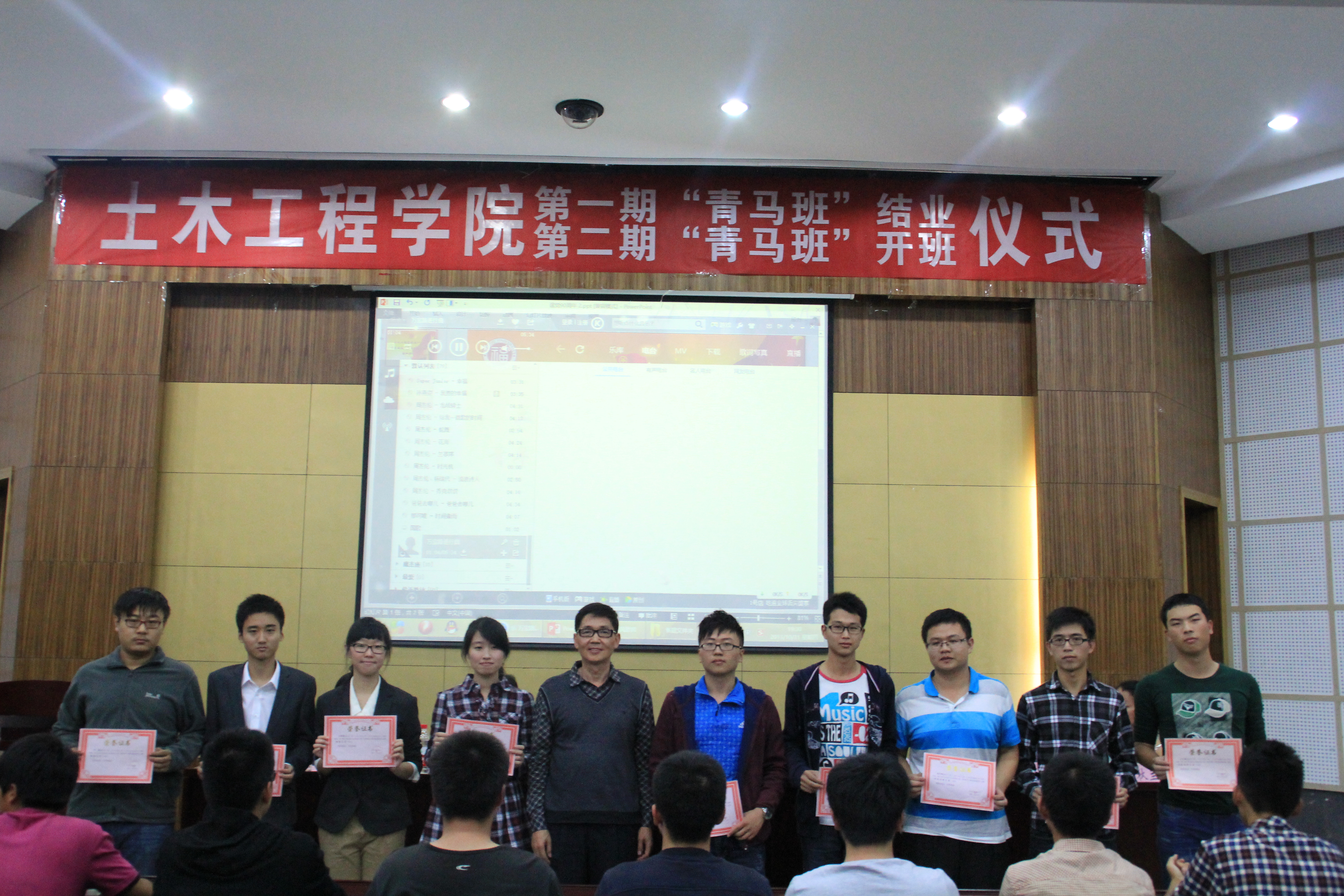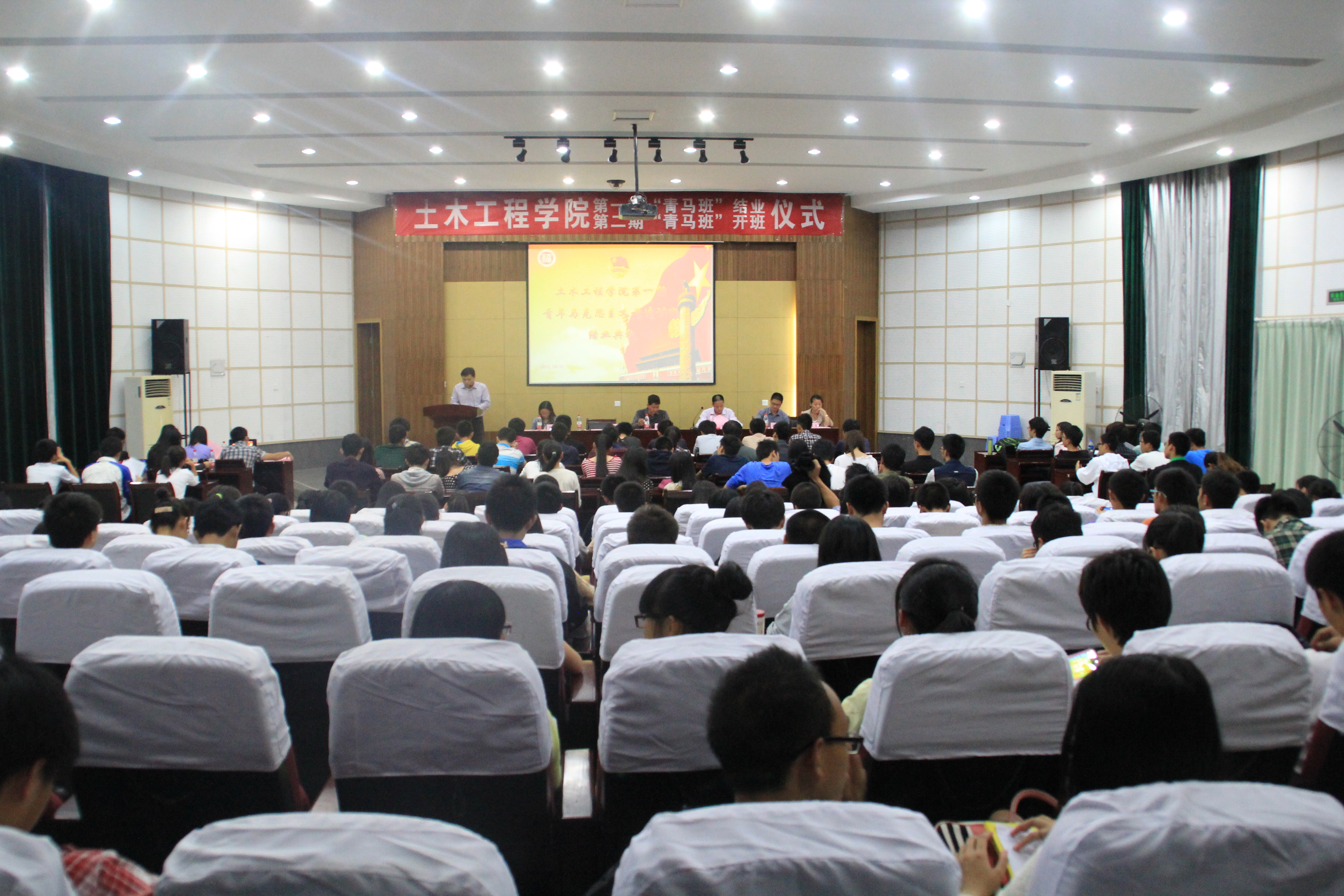 在国歌的余音中,土木学院团委书记许长宾做首届“青马班”培训的工作汇报。他总结了过去一年内“青马班”举办、参与的活动,充分肯定了学员们取得的成绩,阐述了一年来开办“青马班”获得的经验。随后,首届“青马班”学员代表王惺惺结合自身经历,深情回顾过去一年内“青马班”的发展历程,并表达了对新一届“青马班”的殷切期望。在院团委副书记陈秋兰宣读了首届“青马班”优秀学员名单后,院党委陈德铭副书记为优秀学员颁发荣誉证书。