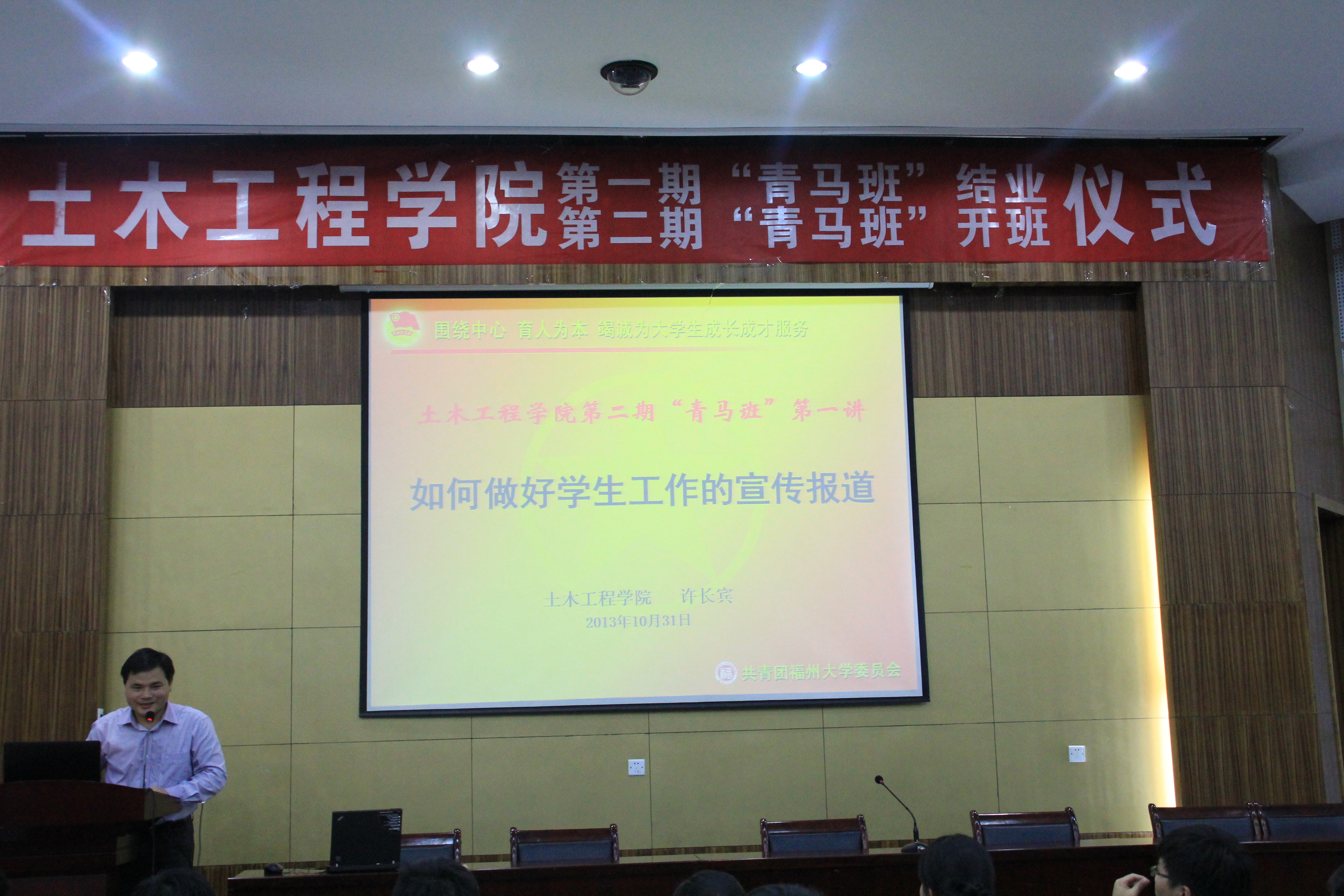 随后大会进行第二期“青马班”开班仪式,院团委书记许长宾为新一期“青马班”成员开展了主题为“如何做好学生工作的宣传报道”的讲座.