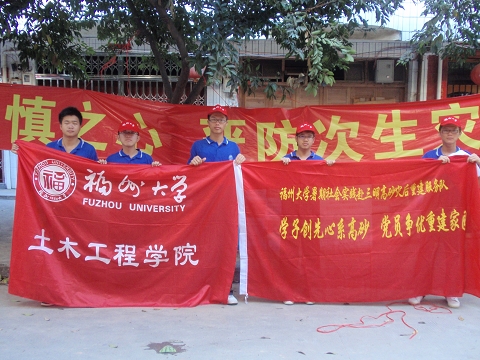 赴三明沙县高砂灾后重建服务团为期7天,把发挥专业优势参与抗洪救灾与文化宣传相结合,在学院路桥系主任胡昌斌教授、水利系主任张挺教授和傅东阳老师、阙云老师的全程指导下,师生一行15人,由该镇党委书记孙树群陪同,深入受灾点实地勘察,为该镇的村镇水毁道路、水利设施以及灾后民房选址等工程出谋划策,并协助该镇编制灾后重建规划和全镇防灾预警系统设计;同时,考虑到工程设计施工的规范性,几位专家教授正联系包括福大土木设计院等在内的有资质设计单位,加紧后续设计工作。另外,实践队员们分深入该镇冲厚、阳溪、龙慈等村担任“村委会主任见习助理”,运用自身专业知识协助当地干部群众进行灾后重建,并进行灾后自救、卫生科普宣传,为“预村官”成长道路积累宝贵经验。与此同时,实践队还向该镇文化站捐赠588册适合农村使用的科普类图书,并在该镇集市举行群众健身舞培训,为该镇文化建设贡献一份力量。