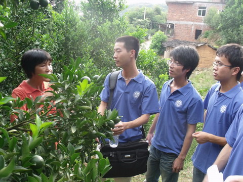 由于芦柑的管理相对简单,农忙时间比较集中,以及黄龙病的影响,使得村中大部分年轻人都外出打工,这就造成了很多留守儿童。我们也对此进行了专门的走访,我们就力所能及的帮忙做点家务活如磨米浆、扫地等,还有到田间浇水、锄地等。并积极与小孩子进行交流,鼓励他们也要读书成才,走出大山,带去了我们对留守儿童的关心。