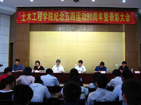 于5月15日下午4点在土木楼多功能厅举行“纪念五四运动90周年暨表彰大会”。出席此次大会的嘉宾有土木学院党委书记张和秋、院长陈宝春、党委副书记陈德铭、副院长祁皑、卓卫东、院团委书记肖强和辅导员陈凌秀、何玮翔、赵国宇、张晶、许长宾、姚学敏。
