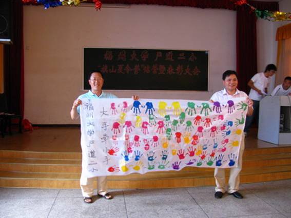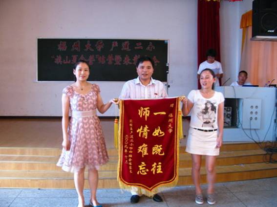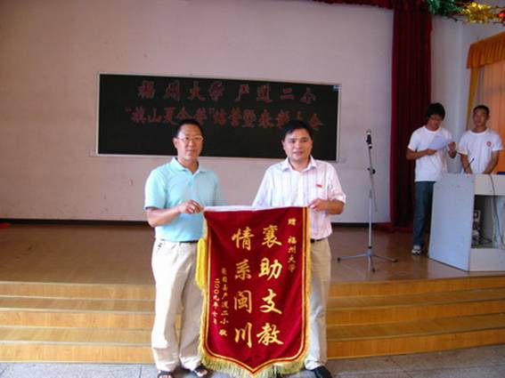 一如既往志愿服务灾区的善举深表感谢。接着,严道二小李毅明校长和学生家长代表为服务团赠送了锦旗,以表深深谢意;同时,许老师代表服务团向严道二小赠送了一面由参营师生共同绘制完成的“大手牵小手”的彩旗,赠送了“闽川情长久、两校缘恒存”的对联,并向各位参营学生的家长赠送了由其子女独立完成的手工作品。接下来,领队许长宾老师与荥经县教育局、团县委、严道二小等领导老师共同为“旗山友谊纪念碑”、“旗山爱心书屋”揭牌。最后,结营仪式在参营学员精彩的音乐舞蹈表演中落下帷幕。