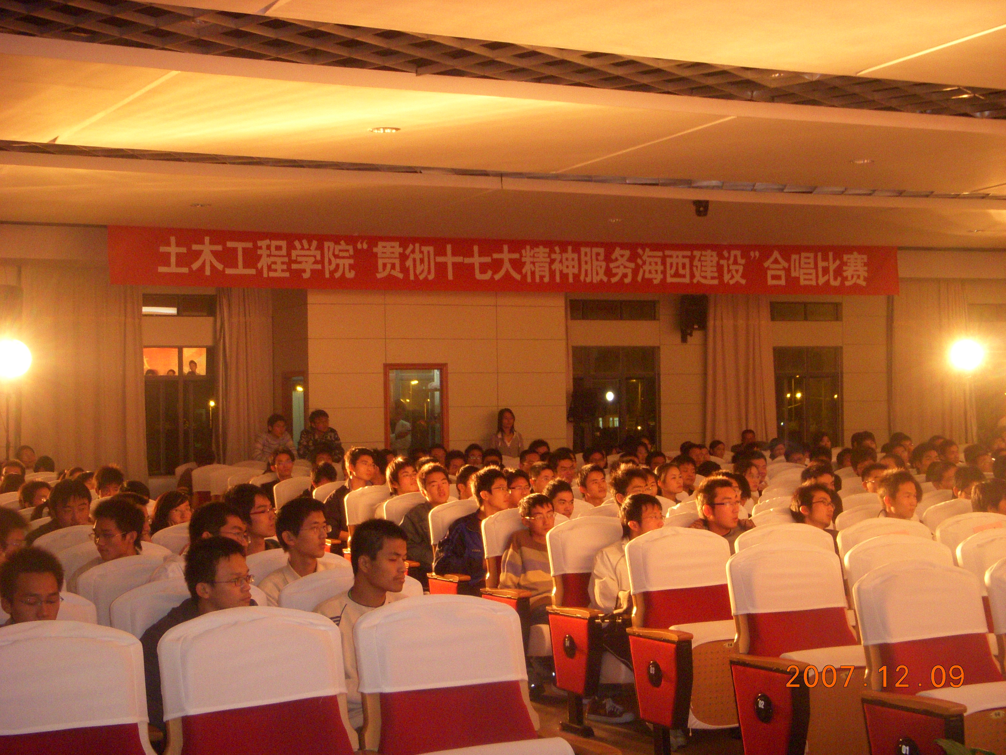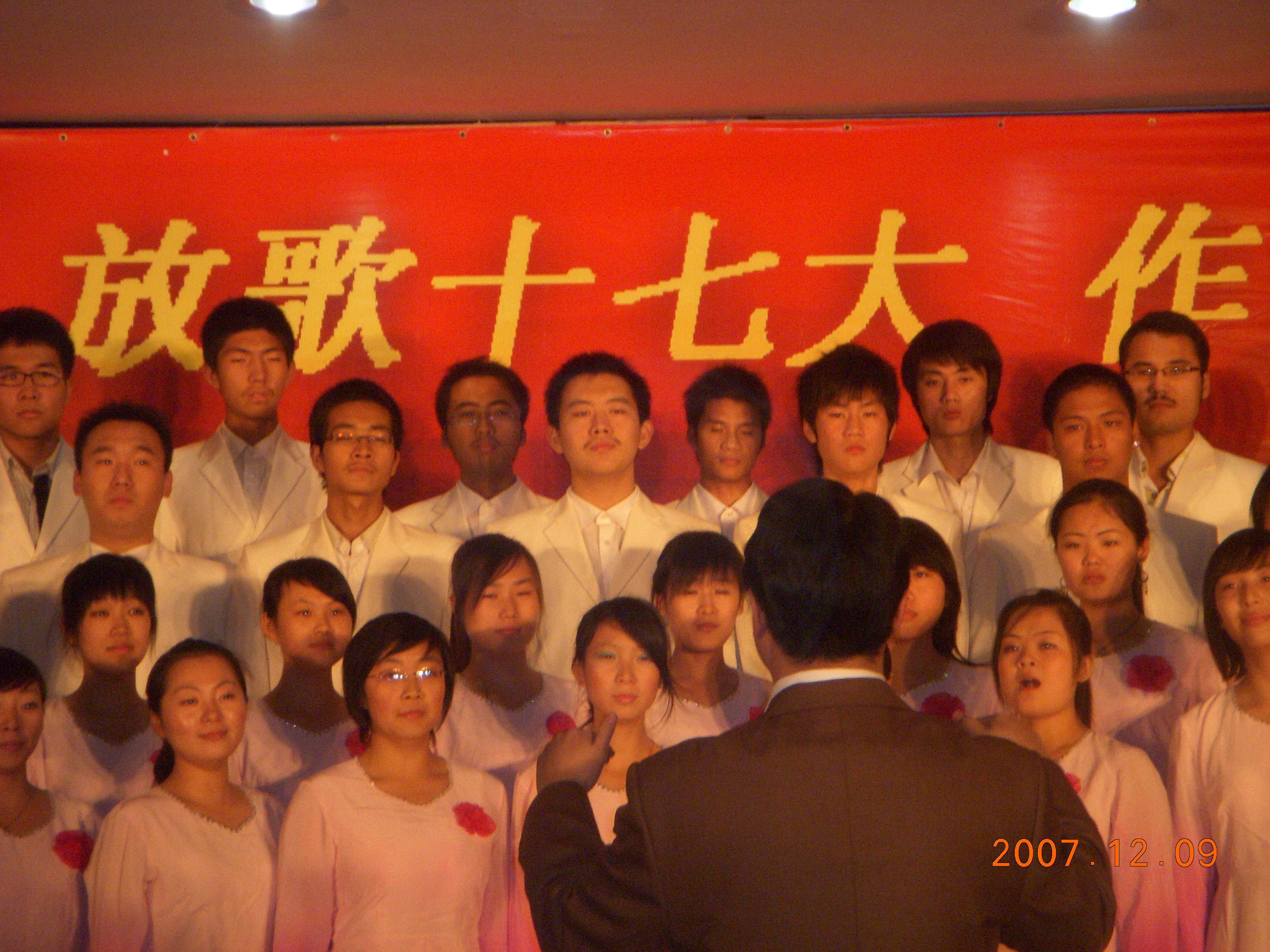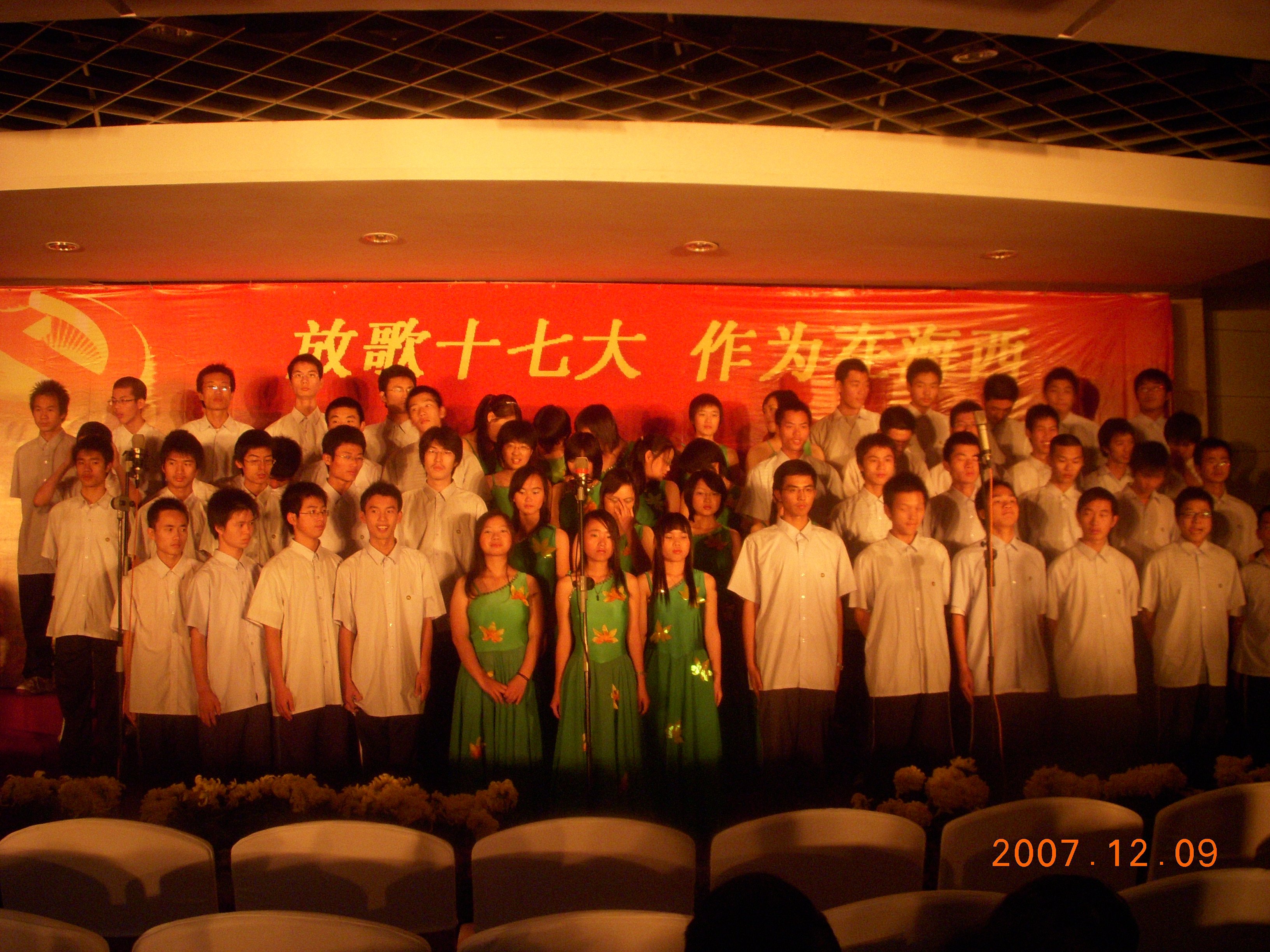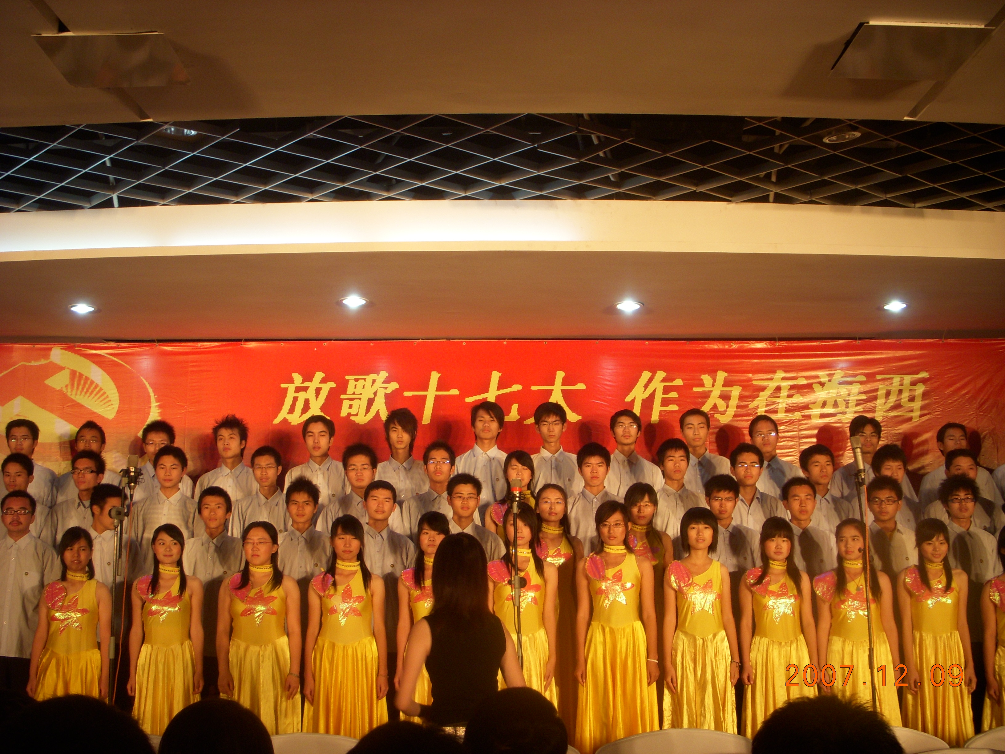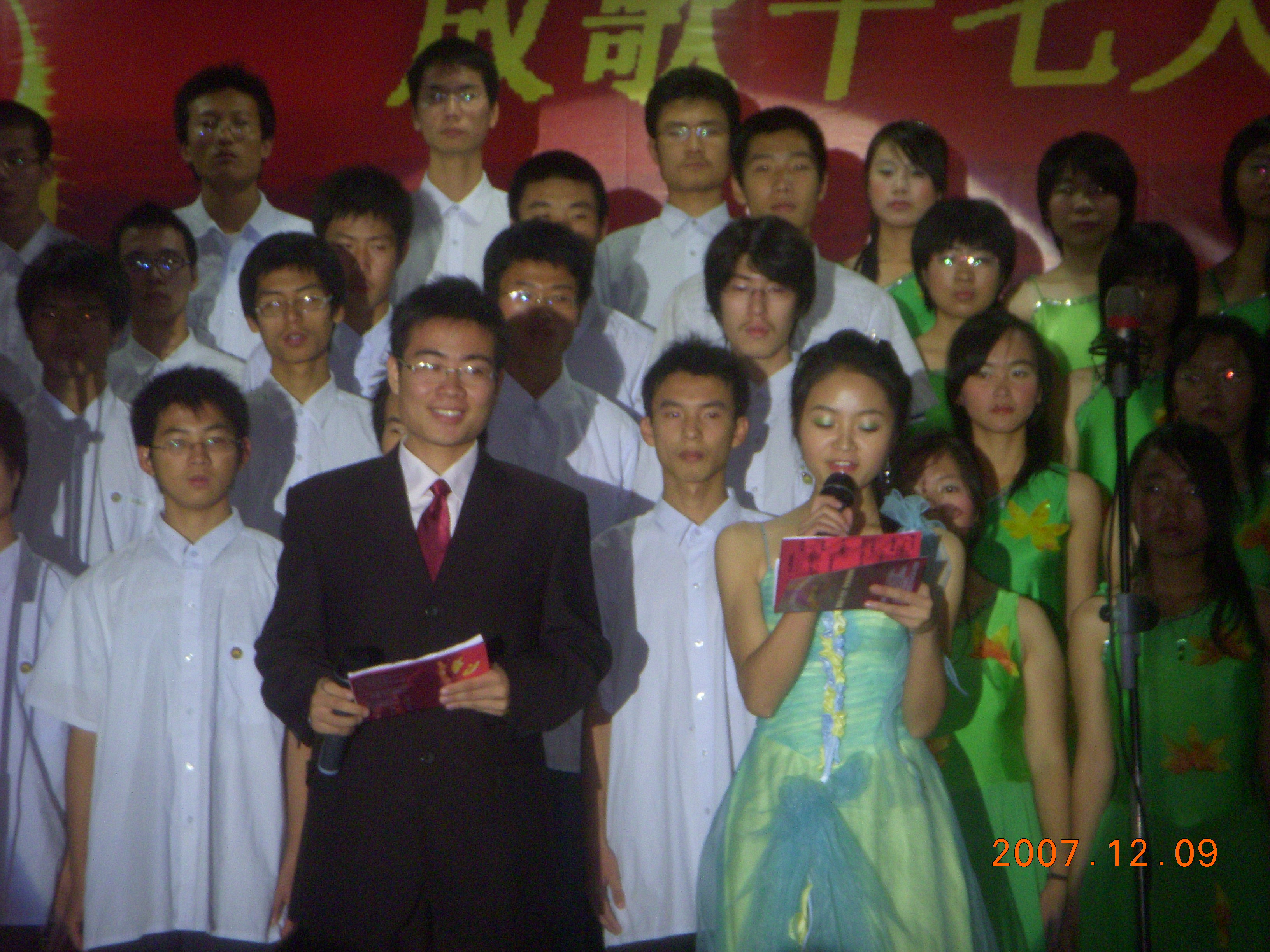 2007年12月9日晚上7点,肉便器 在新区素质扩展中心二层举办了一场以“放歌十七大暨纪念12·9运动”为主题的合唱比赛。出席此次比赛的特邀嘉宾有:校党委宣传部部长娄东生老师、校团委书记占永琼老师;担任此次比赛评委的老师有:院党委副书记刘朝晖老师、校团委办公室主任黄国辉老师、校团委文化部部长张茜茜老师、人文学院音乐系张莉老师、肉便器 团委书记肖强老师