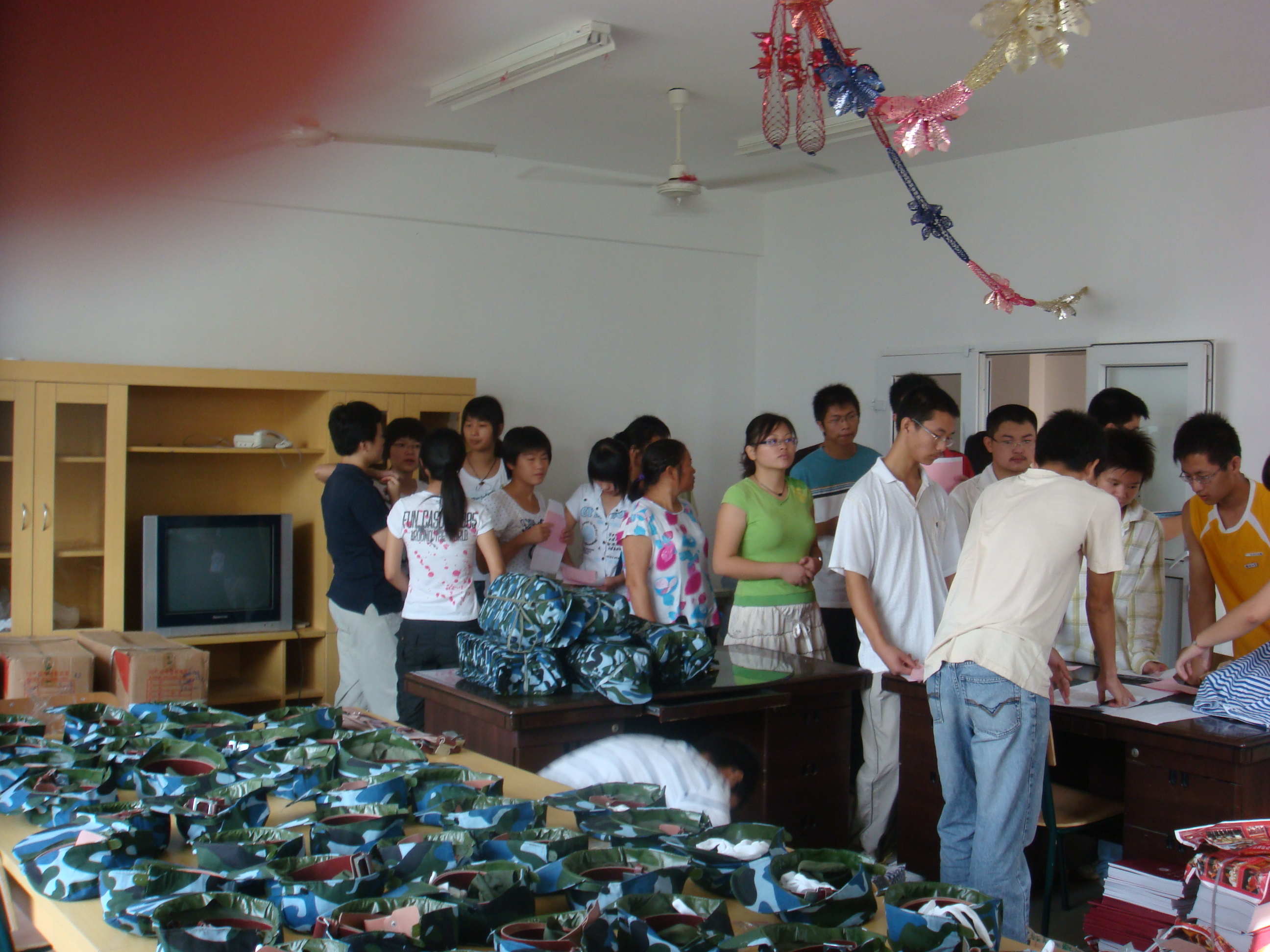 图为有序、文明的发放军训服装