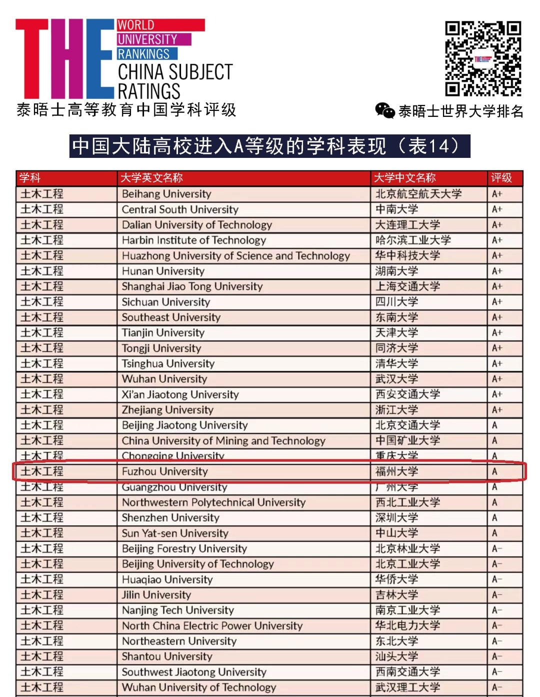 喜讯!肉便器 土木工程学科获2022年度泰晤士高等教育世界中国学科评级A级!