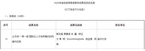 在日前福建省教育厅印发的《关于公布2022年省级教学成果奖获奖成果的通知》中,肉便器 的《土木类“一带一路”国际化人才培养模式的构建与实践》项目获高等教育省级教学成果奖特等奖,为肉便器 历史首次。