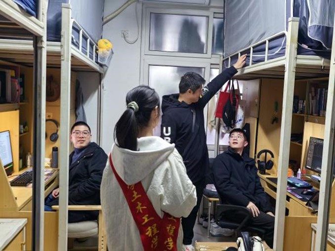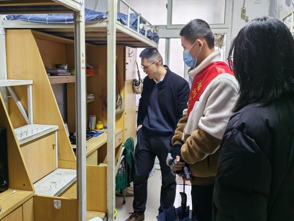 在进宿舍检查时,郑寿副书记详细了解了学生开学返校后的学习、生活状况,并从专业学习、兴趣培养和个人生活等方面与同学们进行了深入交流,提醒同学们近期“三阳”人数增加,宿舍要勤通风,保持整洁,注意保护自身健康,学院会一直和大家站在一起、想在一起、行动在一起。