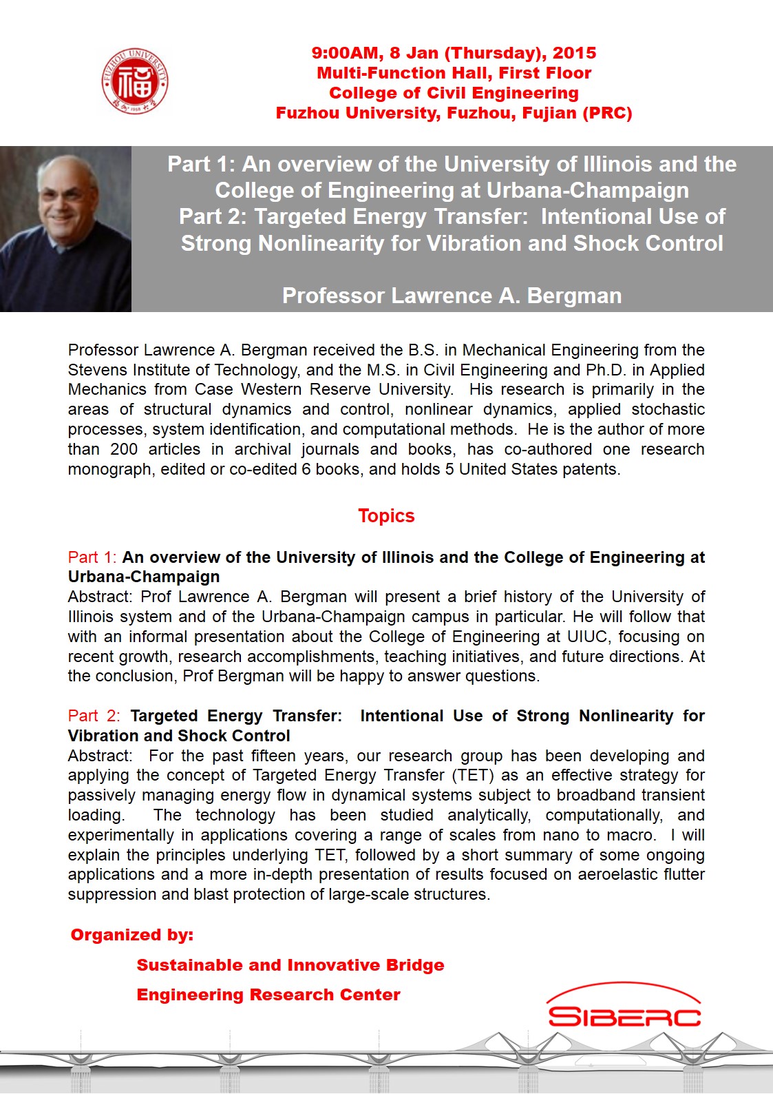 Lawrence A. Bergman教授世界知名线性与非线性动力学与振动专家,著名企业Lord Cooperation 公司多项专利发明人,Fokker-Planck 方程大规模计算方法创始人。Bergman教授的专利技术,被广泛应用和集成到海洋钻井(数千米深)钻头的分层轴承系统、航天飞船上的雷达天线振动隔离系统、航空装备轴系不对中扭振隔离柔性耦合系统以及航空装备机械和结构系统的非线性振动能量抽取系统等高端装备和产品中。