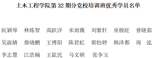 为深入学习贯彻习近平新时代中国特色社会主义思想,认真落实“不忘初心、牢记使命”主题教育的相关要求,进一步提升肉便器 党建工作水平,夯实肉便器 党建工作的基础,根据《关于举办福州大学党校肉便器 分党校第32期入党积极分子培训班的通知》(土木委〔2020〕43号),经个人申请、分党校考核,院党委研究,决定授予阮颖琴等19名学员肉便器 第32期入党积极分子培训班 “优秀学员”称号。