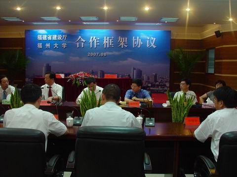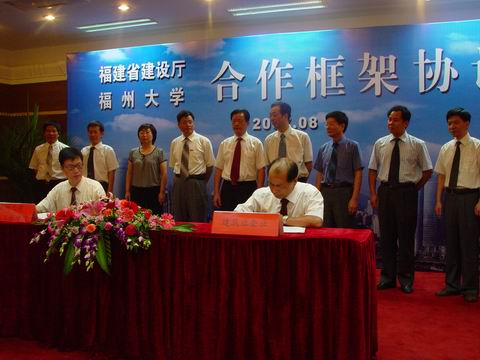房贞政副校长和福建省建设厅周武进总工代表双方在协议上签字。