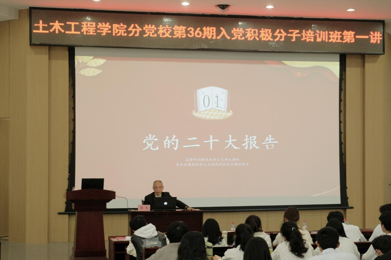 开班仪式结束后,余飞副书记为全体学员带来《学习新思想 奋进新征程——学习贯彻党的二十大精神》党课。他以党的二十大胜利召开为切入点,着重阐述二十大报告的主题,并详细解读一个中心任务、两个“行”、两步走、三个“务必”、三件大事、六个坚持,以及中国式现代化和兴国战略等内容,让同学们了解党的二十大召开、党章修改的重大意义。并以“追梦新时代,奋进新征程“为主题,结合工作实际和土木工程专业发展,引导学员们要不断强化理论武装,提高政治站位,深刻领悟“两个确立”的决定性意义;努力学习专业知识,提升系统思维,加快推进学校“双一流”建设和高质量发展,让青春在建设社会主义现代化国家中绽放绚丽之花。