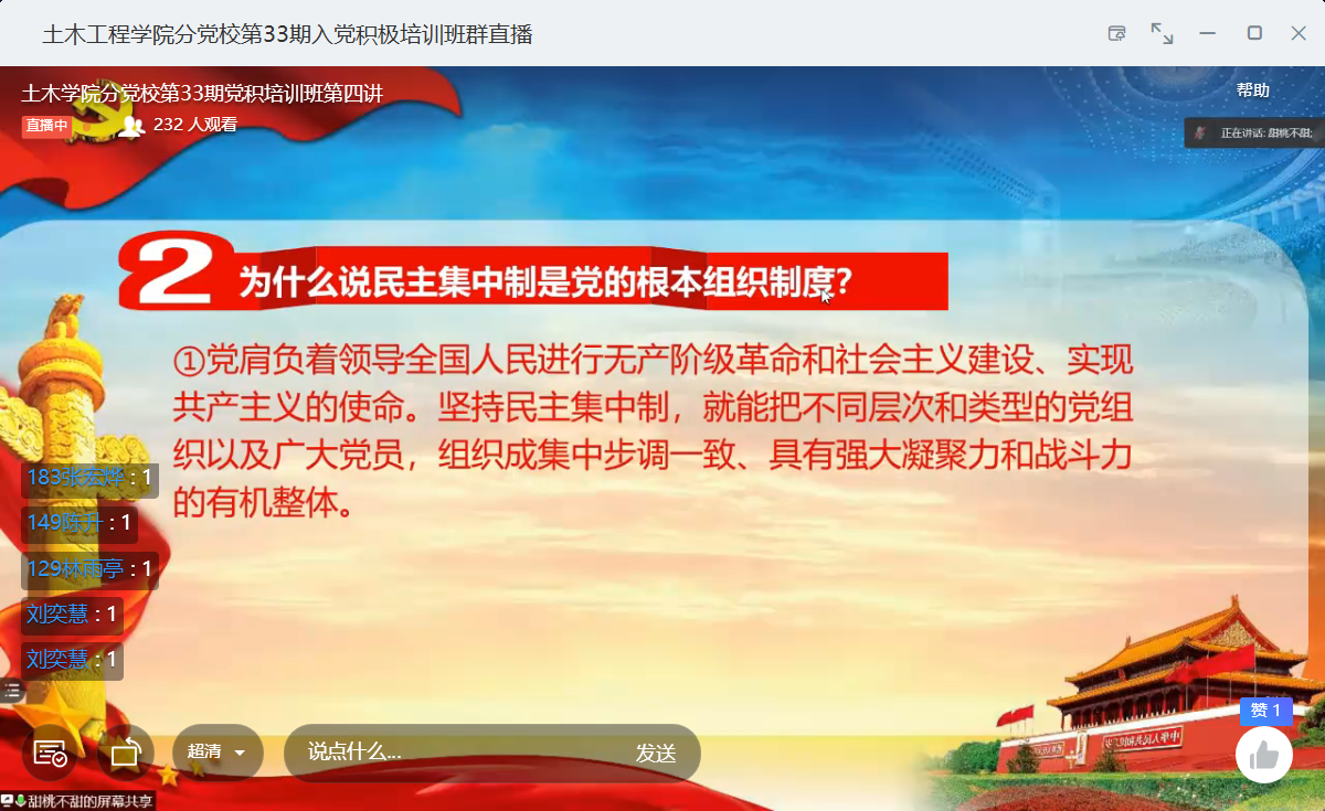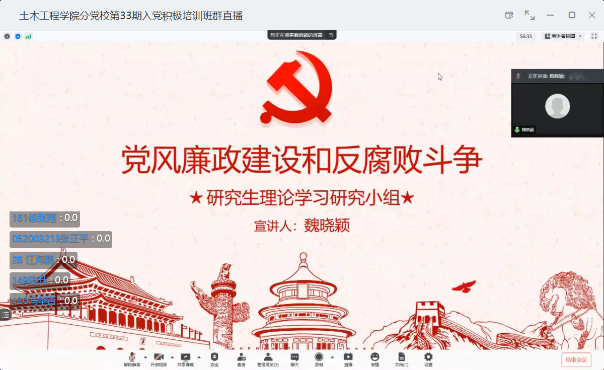 第33期入党积极分子培训班第四讲通过线上形式开展,讲座以“学习党的组织制度,牢记党风党纪”为主题,由研究生理论学习小组的董昕珺、黄超华、魏晓颖三位党员同志分别主讲。