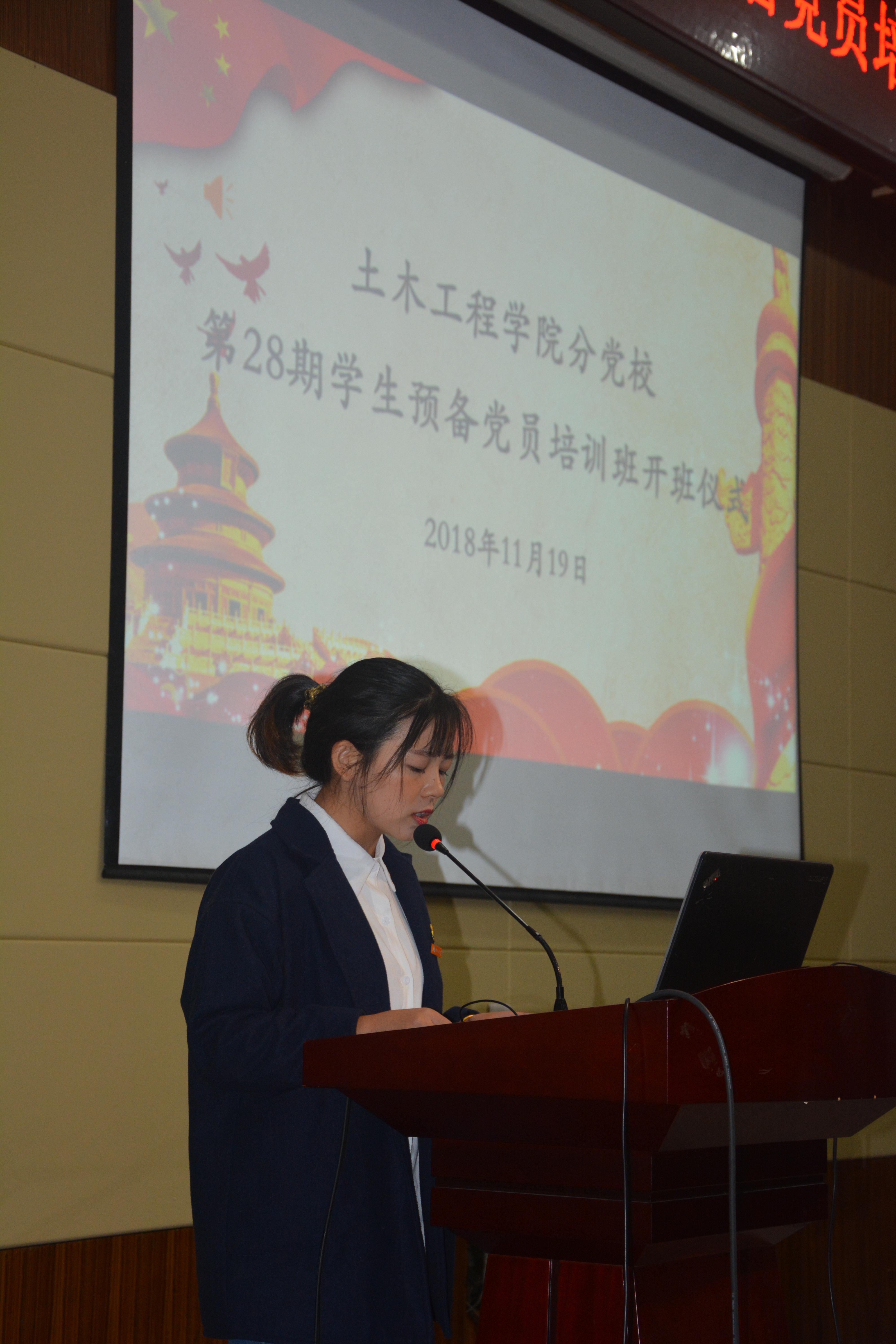 党委于2018年11月19号晚在土木多功能厅举办院分党校第28期学生预备党员培训班开班仪式。院党委副书记、分党校副校长余飞,校马克思主义学院副院长詹志华、校党委党校综合科科长赵艳莉、院党办主任姚学敏等师生共计160余人参加了本次开班仪式。开班仪式由院党委组织员陈秋兰主持。