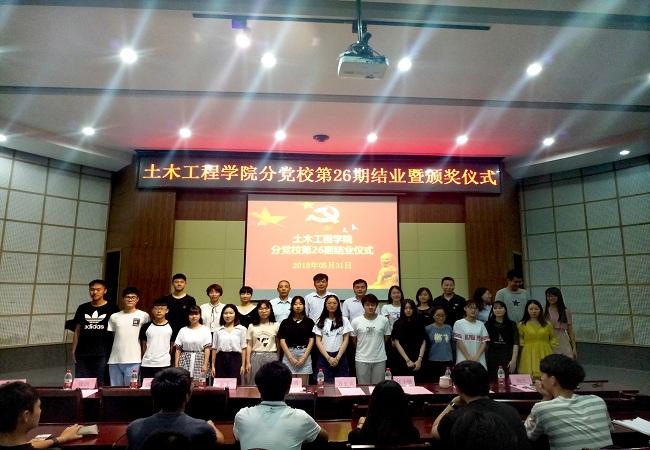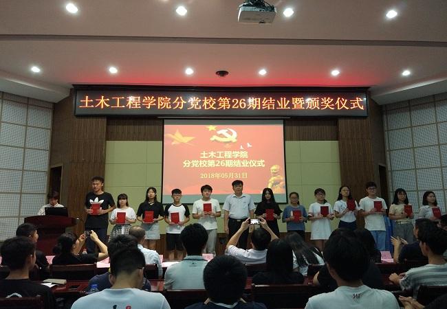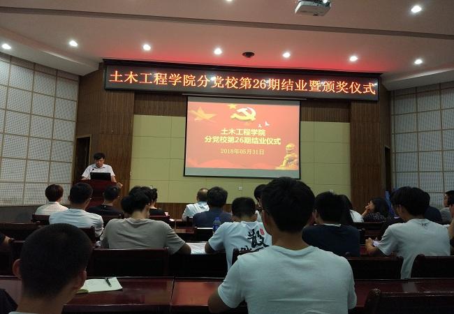 2018年5月31日晚,我院分党校第26期入党积极分子培训班结业暨颁奖仪式在土木工程学院一楼学术报告厅举行。院党委书记、分党校校长黄培明,院党委副书记、分党校副校长余飞,院党委委员、团委书记许长宾,院党办主任姚学敏,全体辅导员以及分党校全体学员共140余人参加了本次结业仪式,会议由院党委组织员陈秋兰主持。
