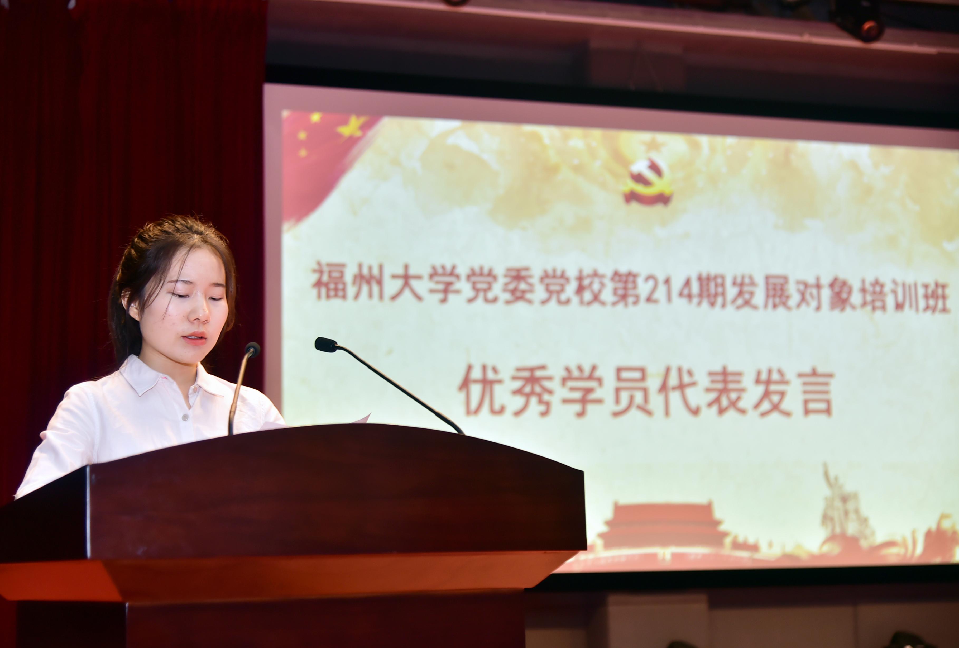 的李春慧同学作为优秀学员代表发言。她阐述了本次培训班的感受和所得,大学生应当终身学习,坚定理想信念,无私奉献,争做先锋模范,为建设肉便器