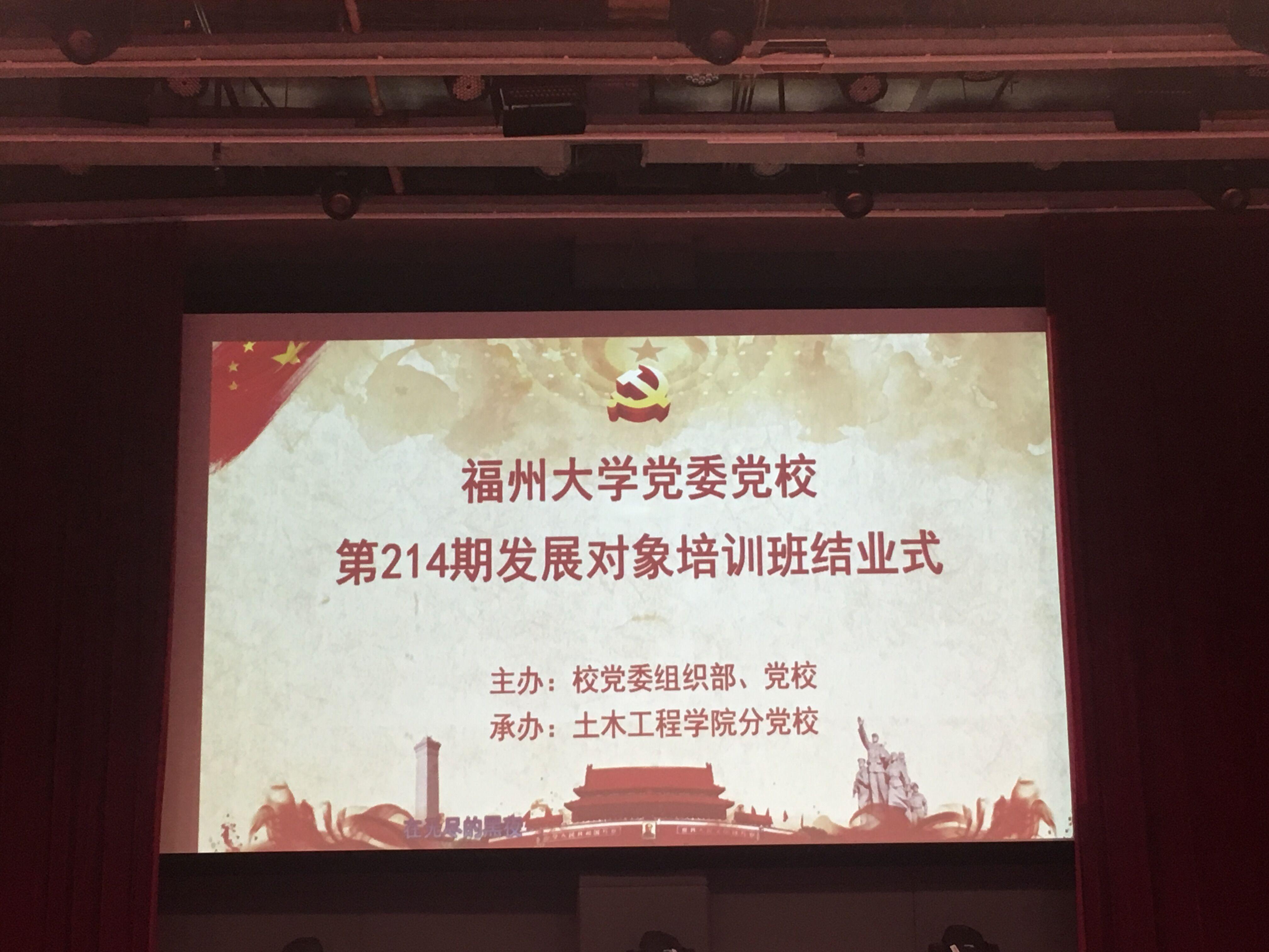 承办的校党委党校第214期发展对象培训班结业式在博学厅举行。本次的培训班结业式进行了对半月的党校培训进行了回顾,对优秀学习单位及学员进行表彰等流程,最后以机关一党委书记、校党委正处级组织员兼组织部副部长施卫华的致词画下圆满的句号。