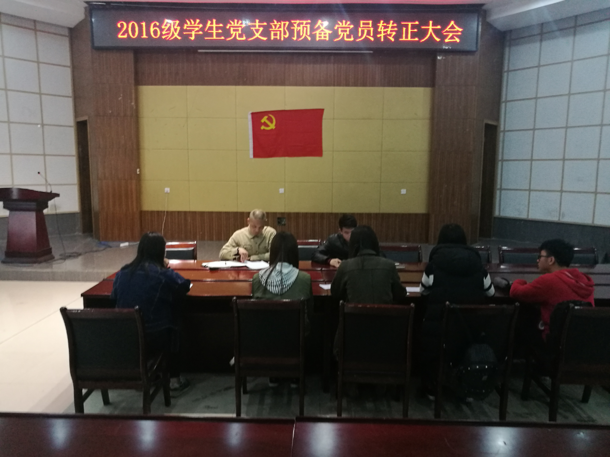 党委副书记余飞,2016级党支部书记李坤皇同志,辅导员李小倩同志及研究生党员与预备党员吕诗德同志。这次会议主要议程是讨论预备党员吕师德同志转正事宜。