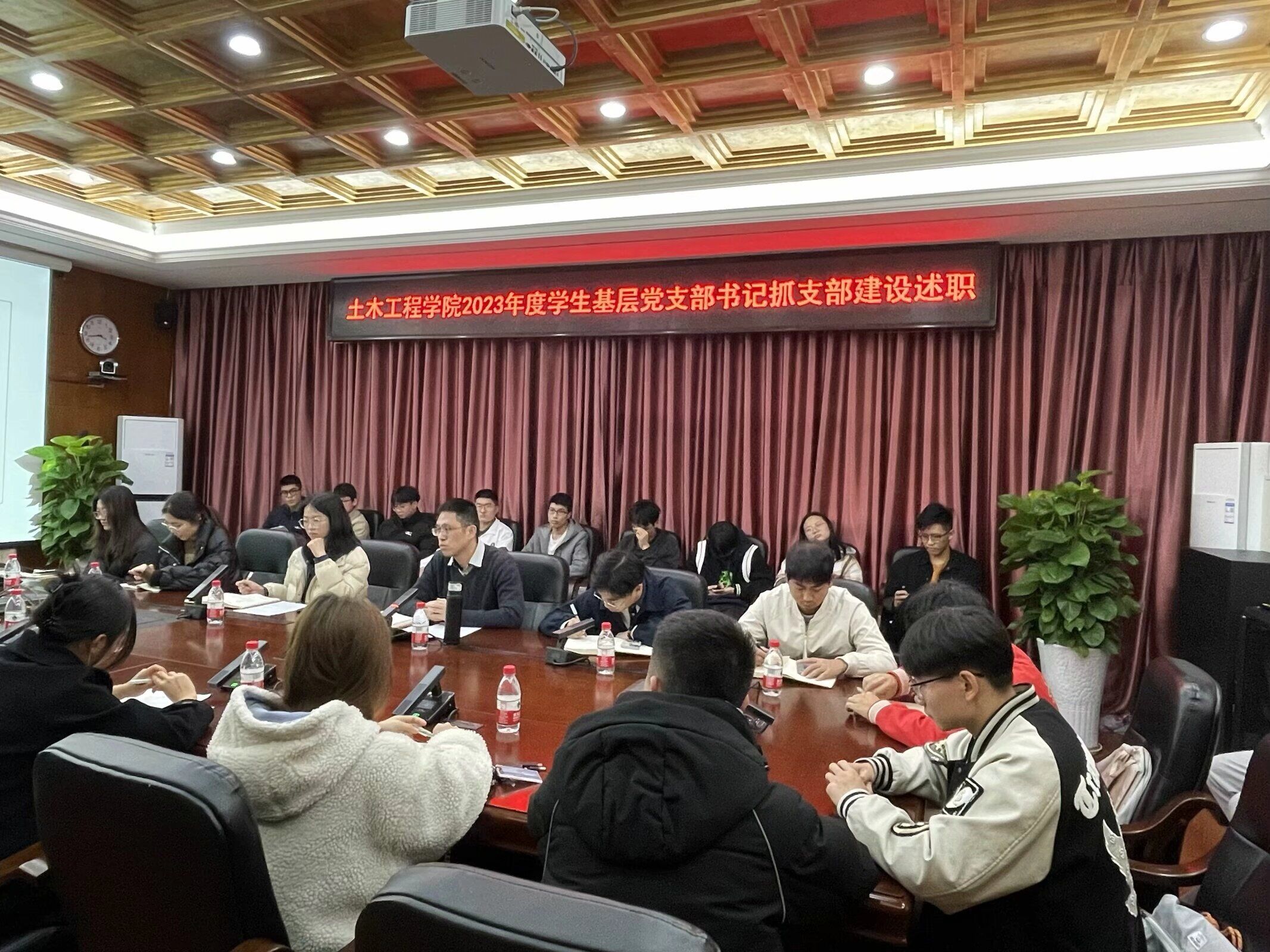 于6楼会议室召开2023年度学生党支部书记抓基层党建工作述职大会,院党委副书记郑寿、各年级辅导员和37个学生党支部书记出席会议。