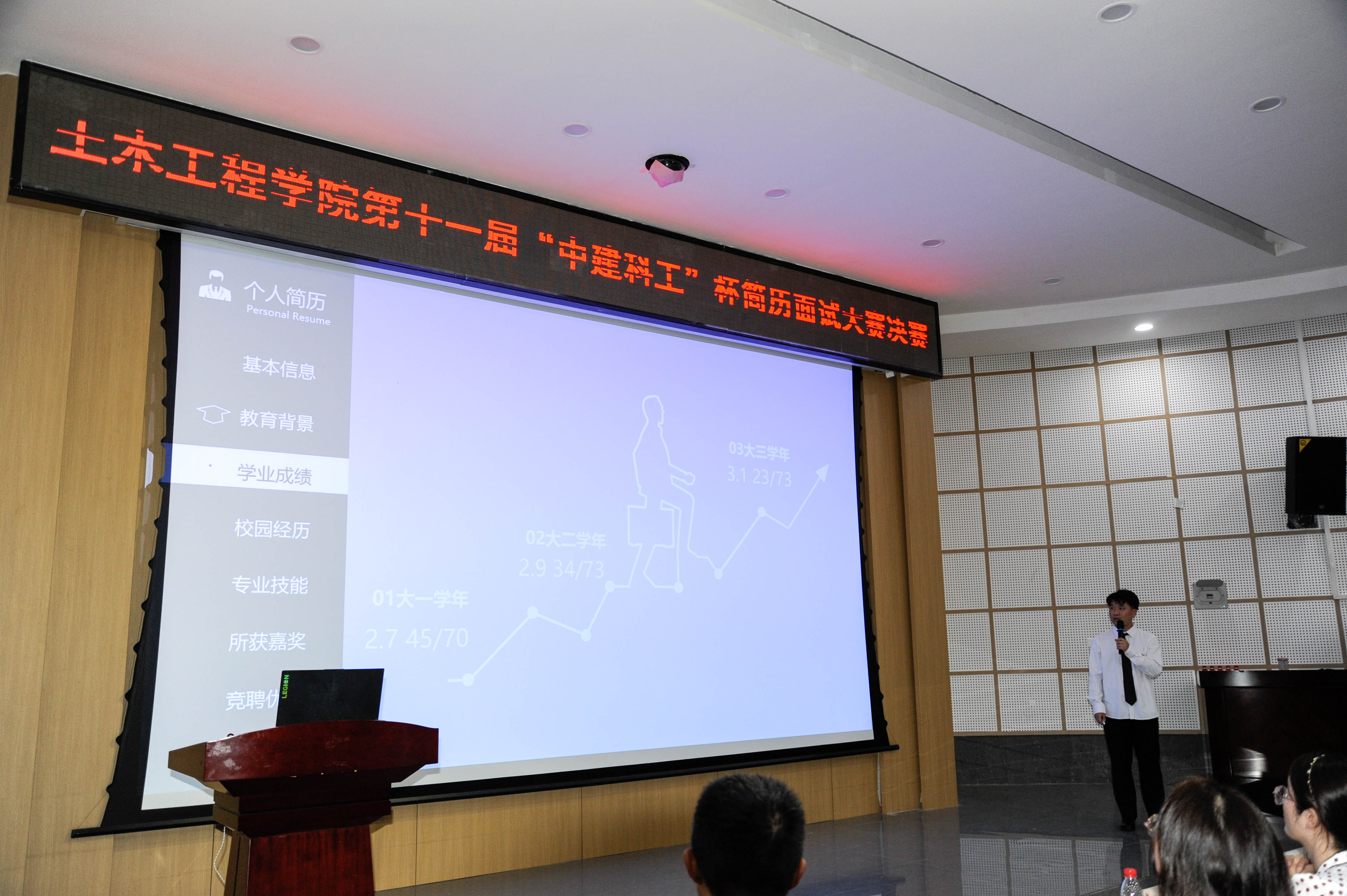 每位参赛选手通过1分钟的自我介绍和5分钟形式新颖、内容丰富的PPT展示,向评委和观众介绍了简历制做的全过程,并结合自身的专业知识、娴熟的面试技巧,巧妙回答评委们的提问,整场比赛掌声连连、氛围热烈,高潮迭起。最后,中建科工集团福建有限公司人力资源部商金生经理对整场比赛做了点评,他深层次的解析了一份优秀简历如何制作、比赛现场如何克服紧张心理,并结合自己的成长经历就土木学生如何在土建行业立足与发展提出宝贵的意见建议。