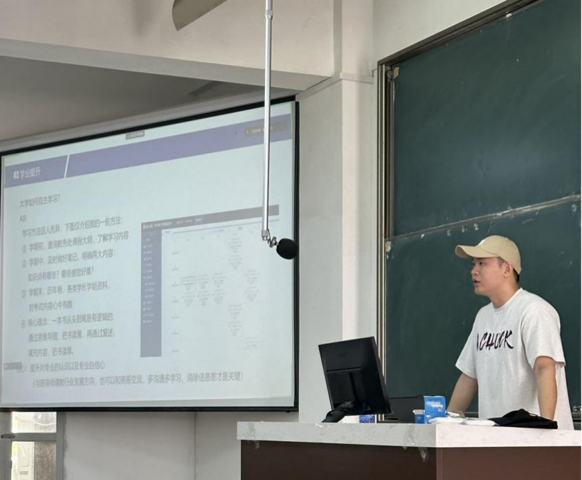 习近平总书记在学校思想政治理论课教师座谈会上强调:“要坚持显性教育和隐性教育相统一,挖掘其他课程和教学方式中蕴含的思想政治教育资源,实现全员全程全方位育人。”朋辈教育是促进大学生自我教育的有效形式。为帮助2023级本科新生更好地适应大学生活,从朋辈榜样身上寻找人生价值,锚定青春航向,扬起人生之帆,学院于2023年8月28日上午邀请2023届本科毕业生张少坤,结合自身大学成长经历,与新生们分享了自己在学业、科研、学生工作和创新创业等方面的收获。
