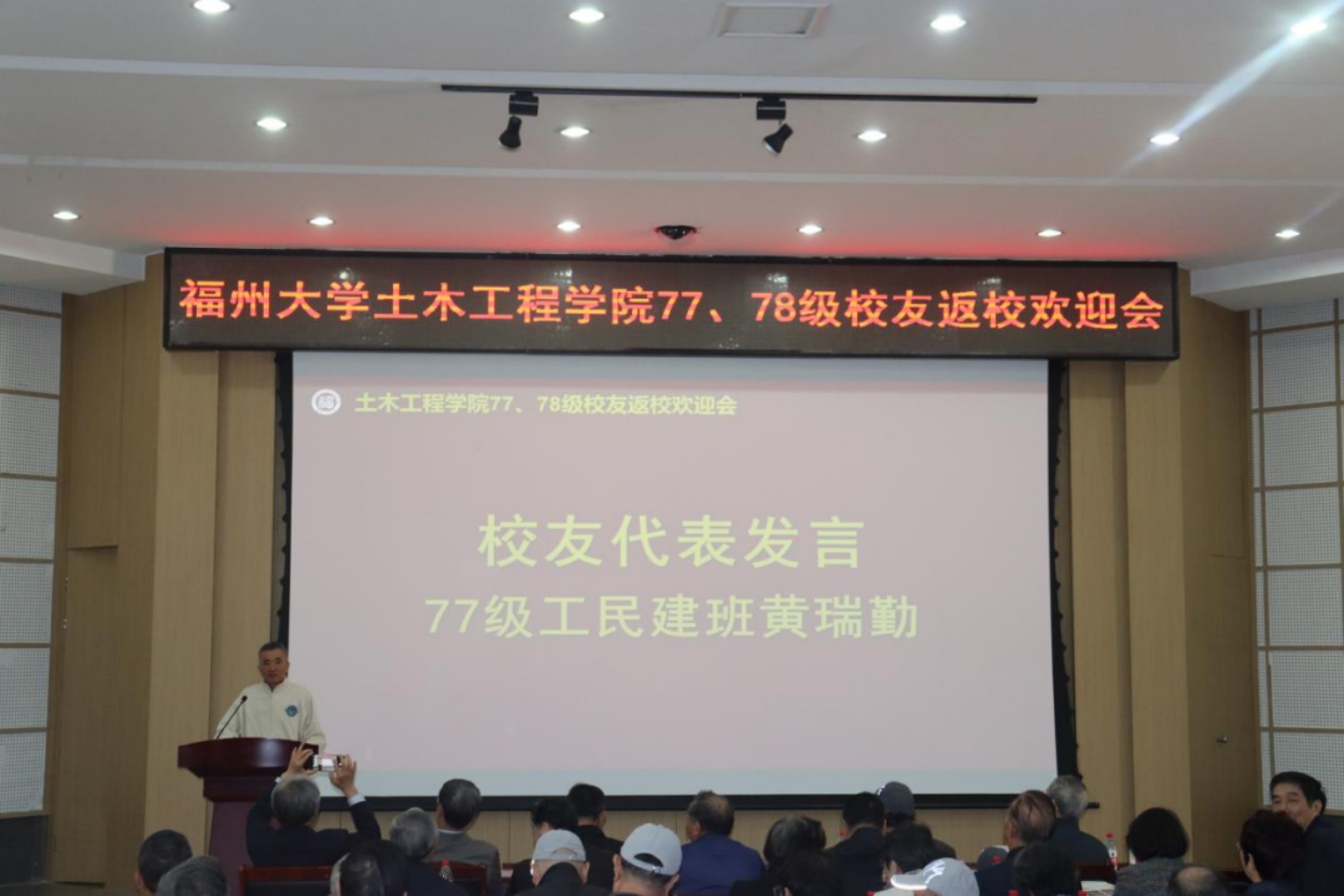 随后,77级工民建班黄瑞勤、78级路桥班陈宜言校友分别上台分享经历与感悟,对在福大土建系度过四年时光感到荣幸和难忘,表达了对母院的感恩之情,并祝福母院越办越好,再创辉煌!作为教师代表,水利水电工程系老教师程心恕回忆起自己陪伴77、78级同学们一起学习成长的大学时光,看着同学们取得的成就,感到激动与喜悦。