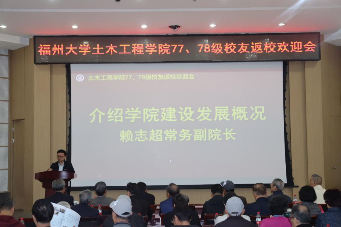 学校欢迎会后,学院在土木多功能厅为77、78级校友举行欢迎会。院党委书记黄培明、院长布鲁诺、常务副院长赖志超等党政领导、师生代表与返校校友共聚欢迎会。